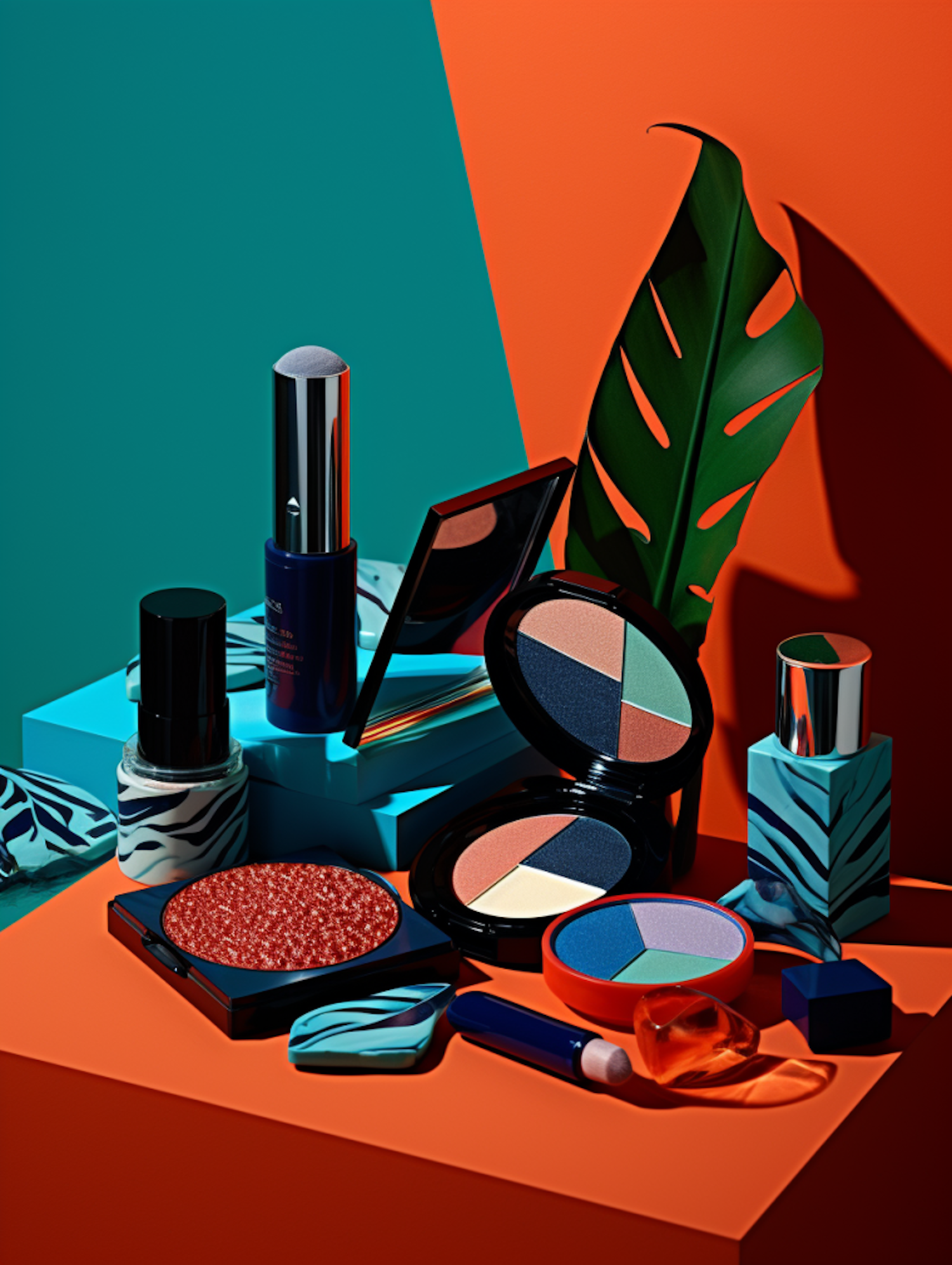 Vibrant makeup display with colorful palettes, bold packaging, and a tropical leaf on an orange and teal backdrop.