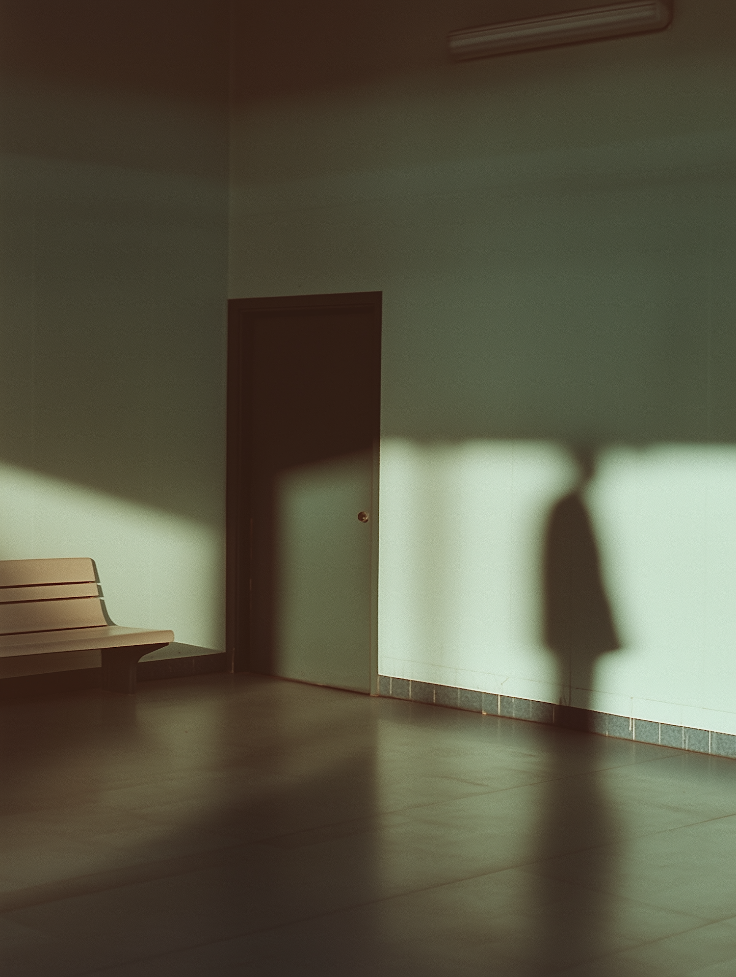 A minimalist room with a mysterious shadow cast on the wall, creating an intriguing atmosphere with muted green tones and a wooden bench.