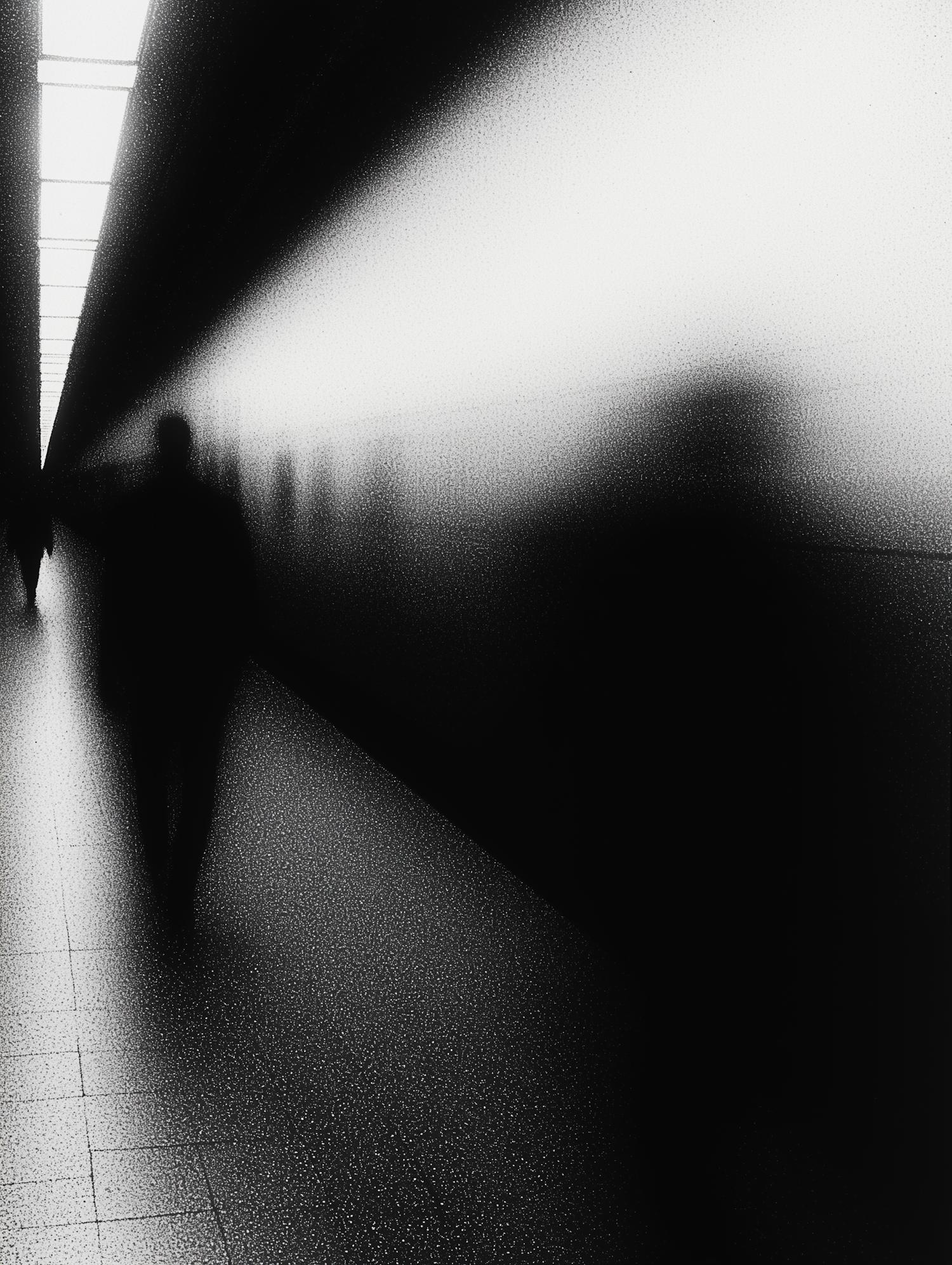 Abstract monochrome corridor with blurred silhouettes and dramatic lighting, evoking mystery and solitude.