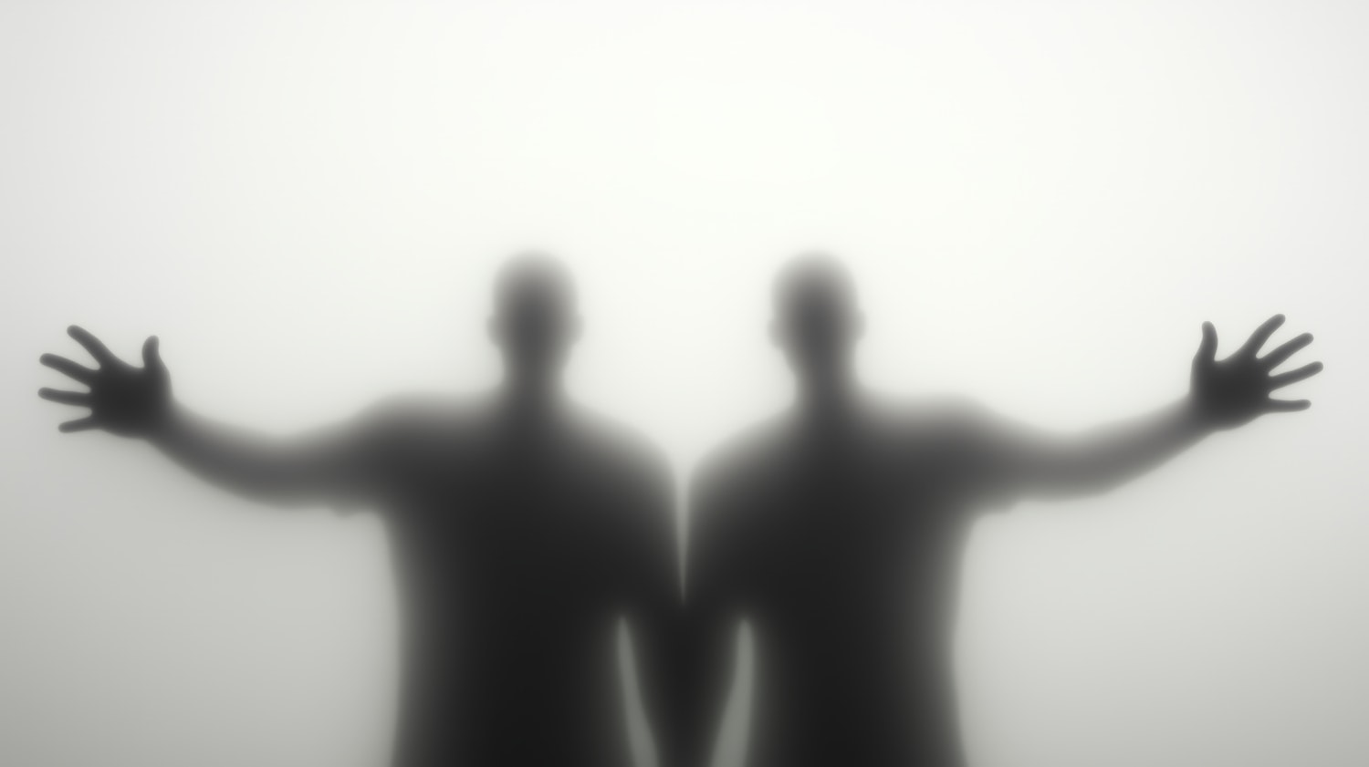 Two shadowy figures behind a frosted surface, one reaching out with splayed fingers, creating a mysterious and eerie atmosphere.