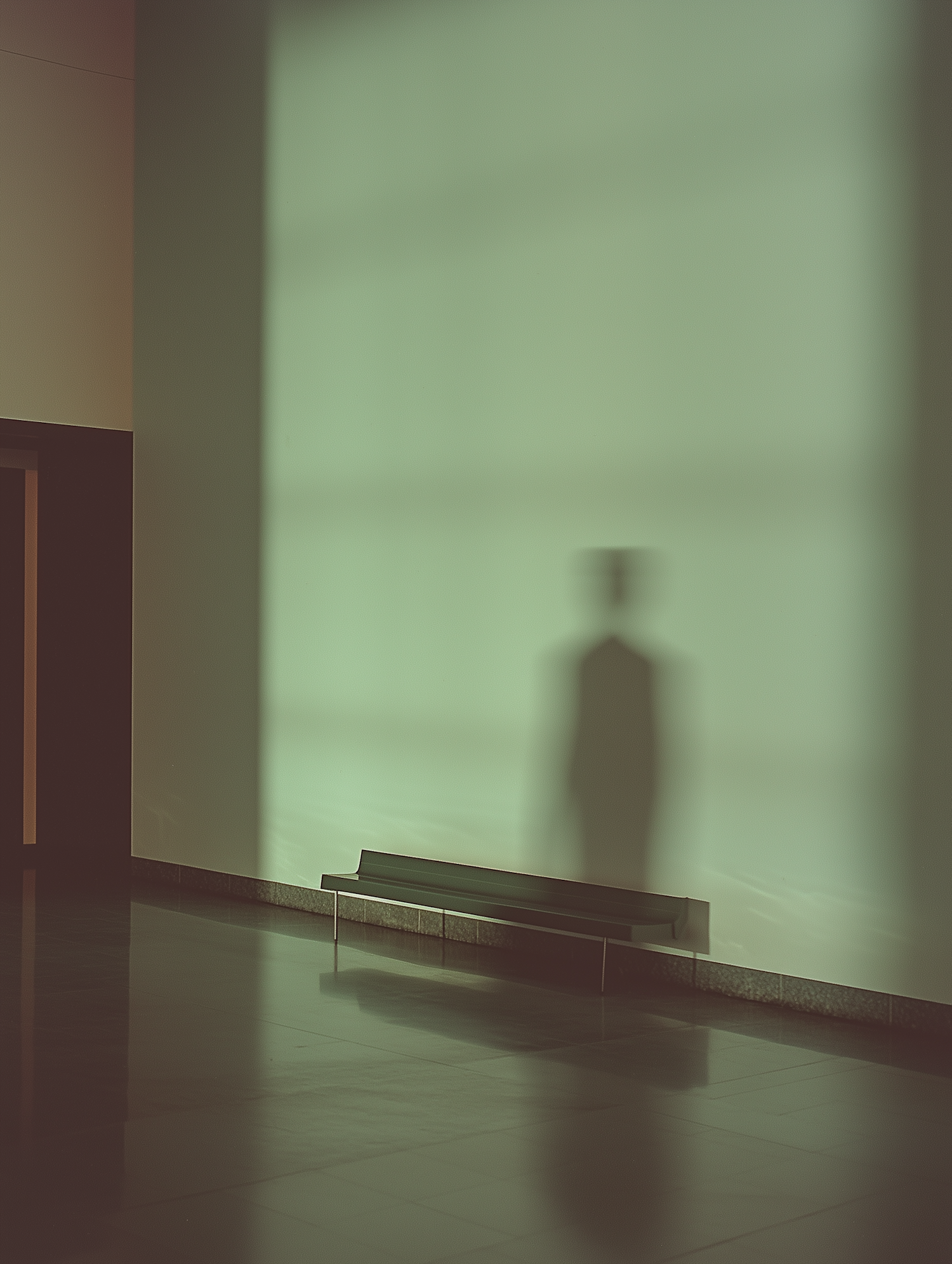 Minimalist interior with a green wall, shadow of a person, and a sleek bench. Light and shadow create a mysterious atmosphere.