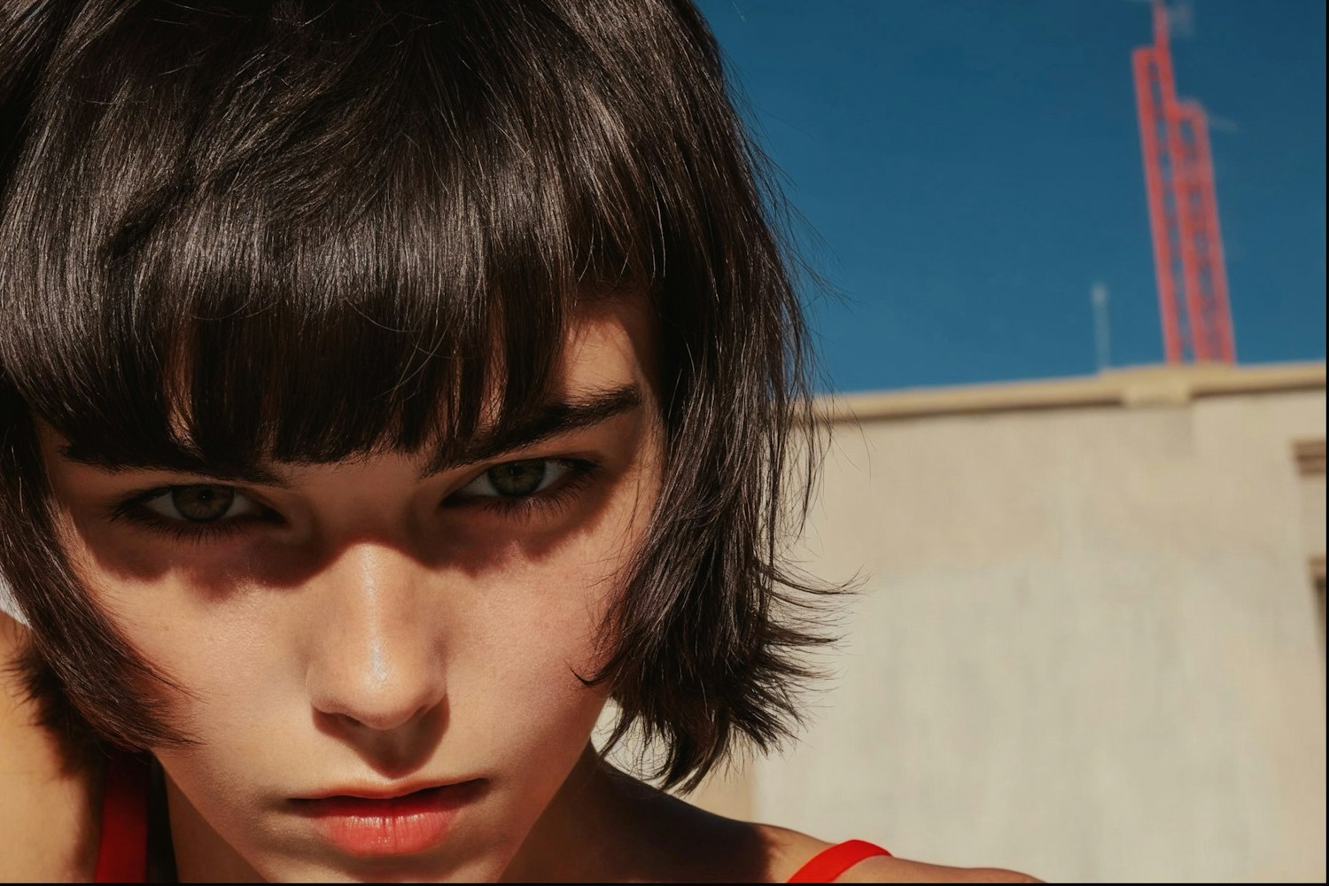 Close-up of a person with short dark hair and green eyes, bathed in sunlight with a blue sky and urban elements in the background.