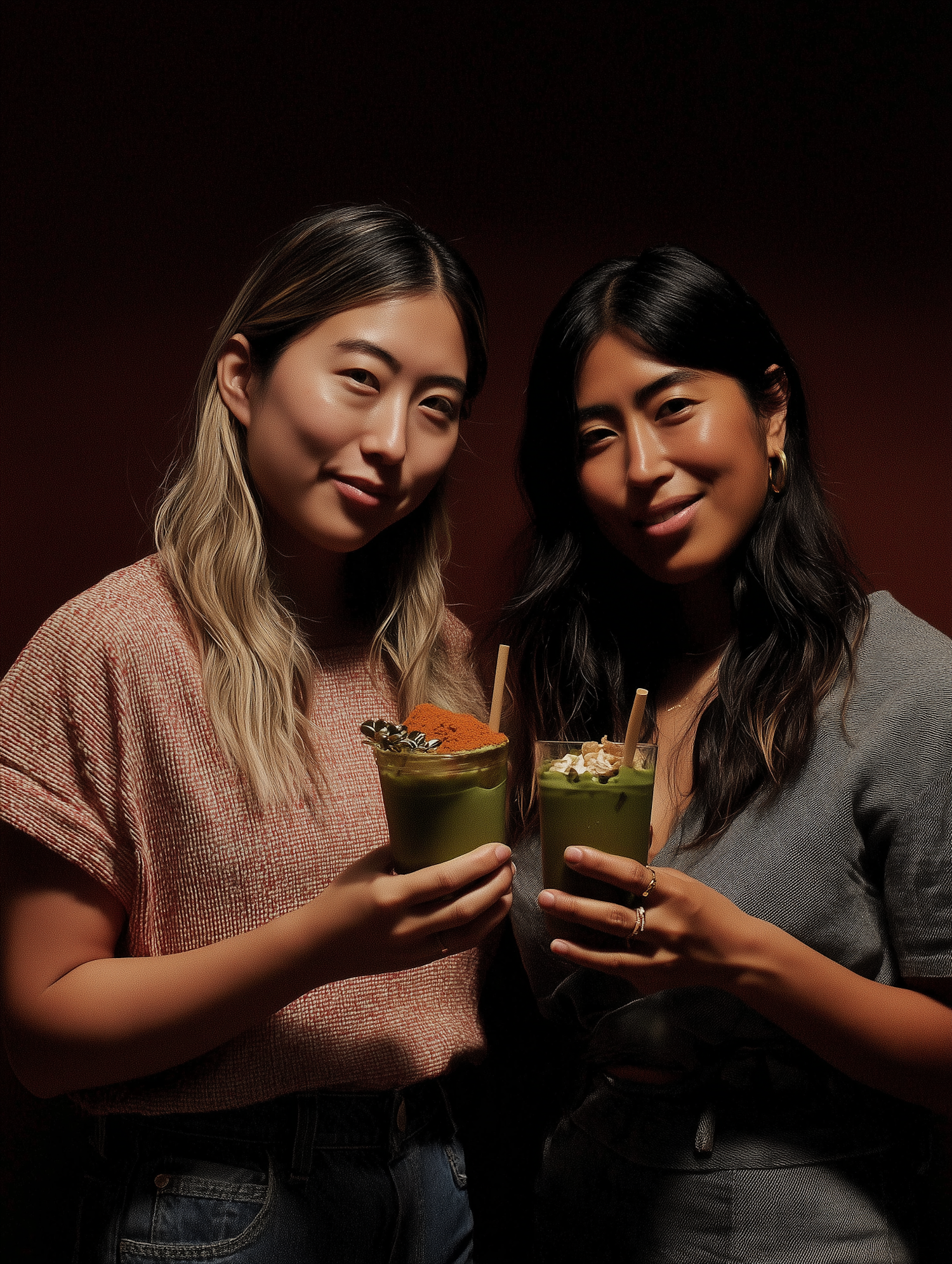 Two friends enjoying green beverages with unique garnishes, captured in a warmly lit setting with a dark background.
