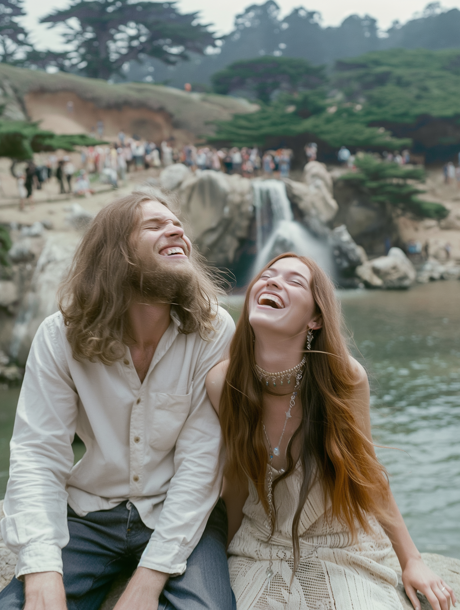 A joyful couple laughing by a waterfall, surrounded by lush greenery and a lively crowd in the background.