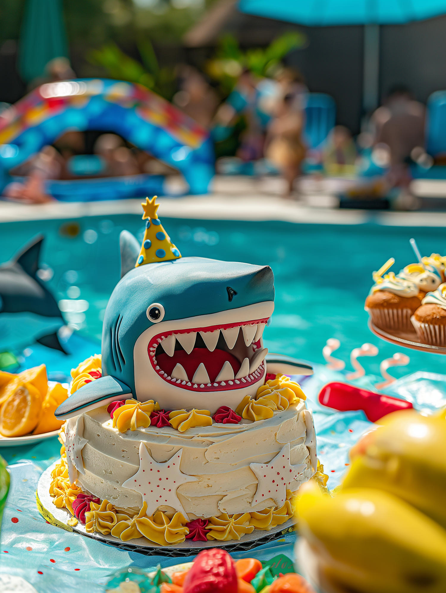 Shark-themed birthday cake with fondant shark topper at a lively pool party, surrounded by cupcakes and summer decorations.