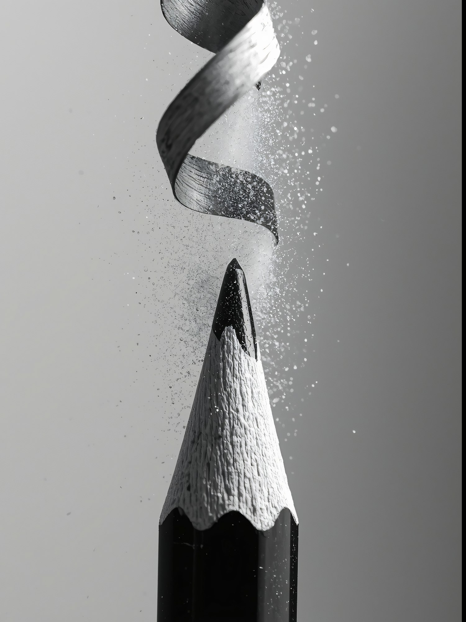 Close-up of a sharpened black pencil with spiraling shavings and graphite particles in a gray background.