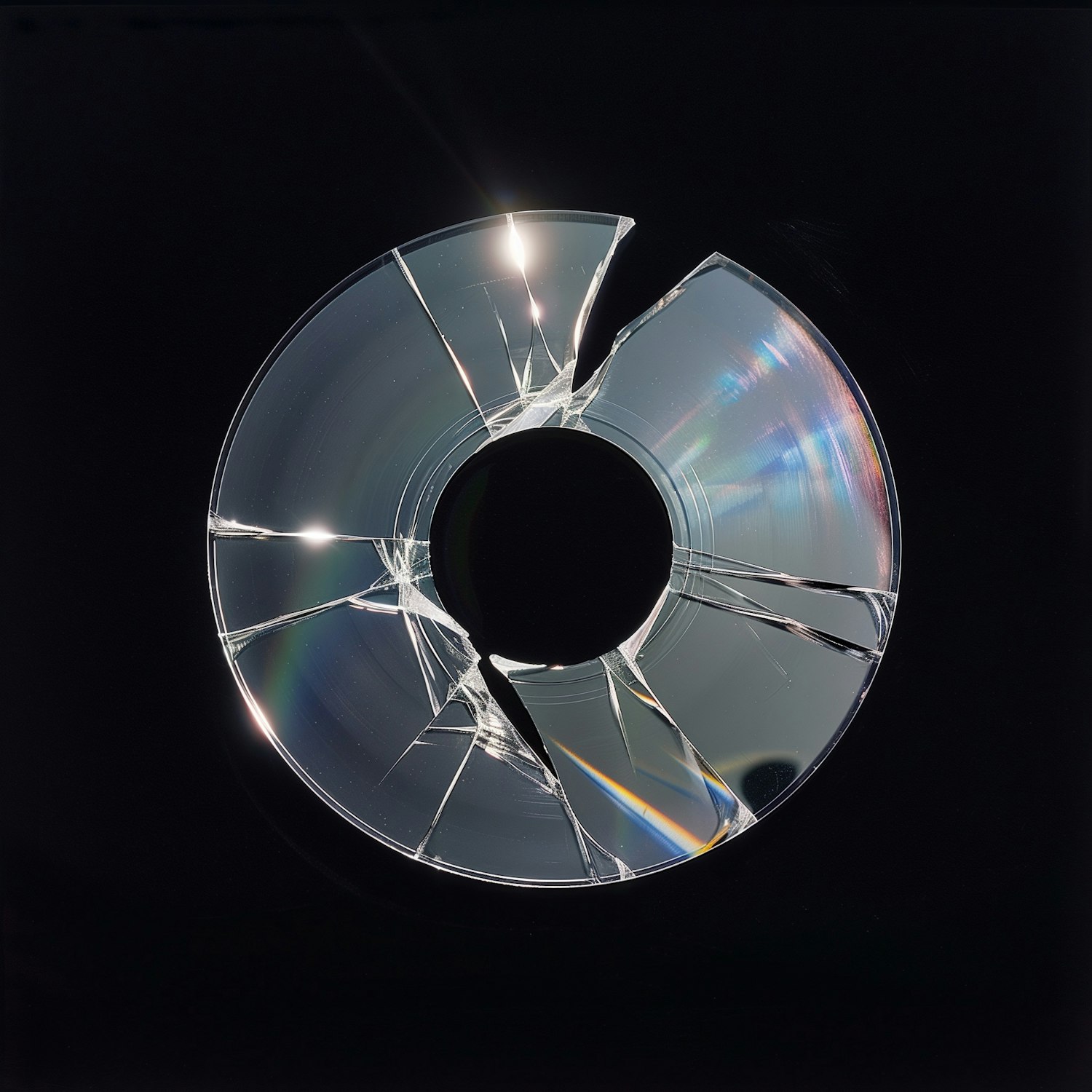 A shattered CD with rainbow reflections on a black background, showcasing sharp fragments and a striking contrast of light and dark.