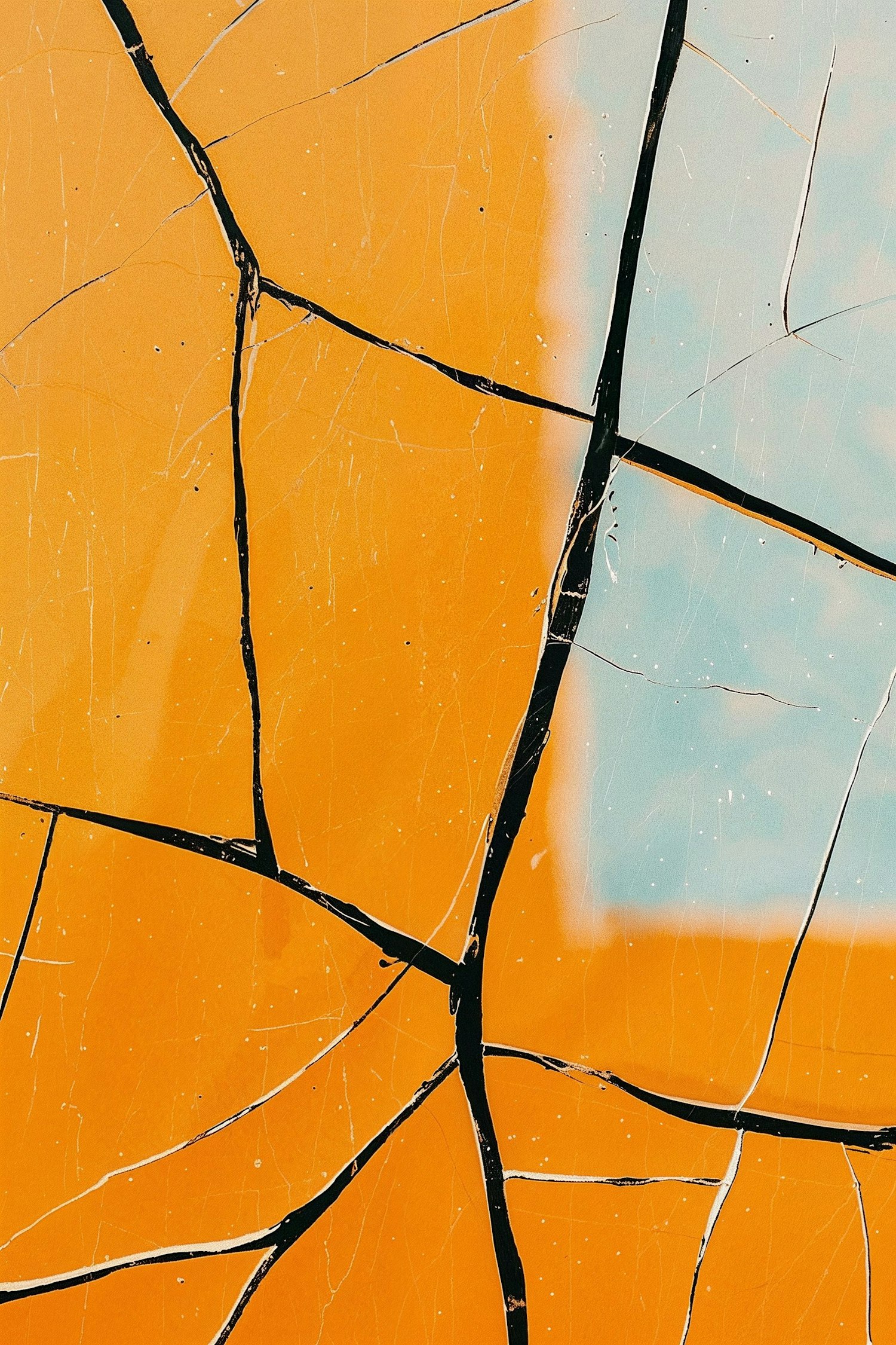 Abstract cracked surface with bold black lines on vibrant orange and light blue background, creating a striking visual contrast.