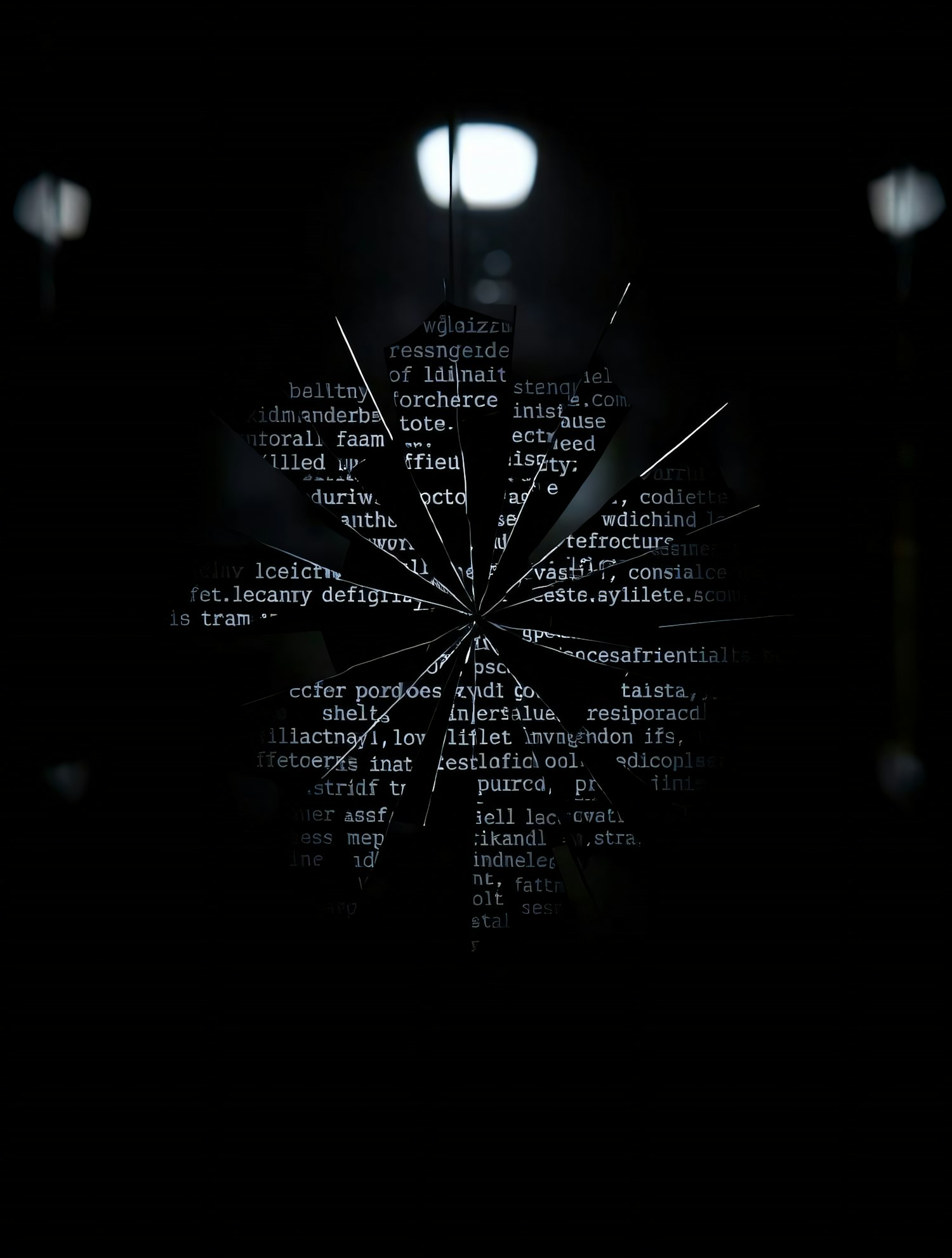 A dark scene with shattered glass and illuminated text, creating a mysterious and technological atmosphere.