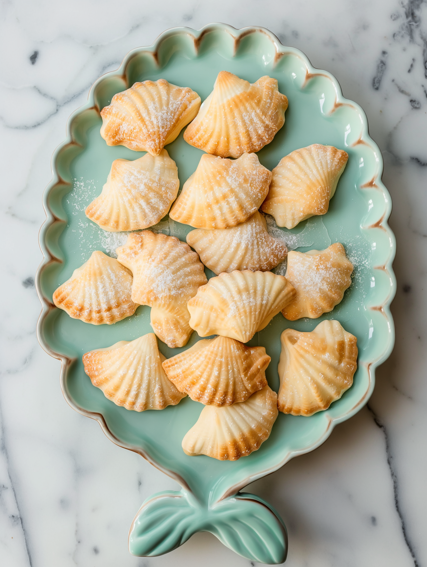 Shell-shaped cookies on a pastel green plate with powdered sugar, set against a marble background for a chic and elegant presentation.
