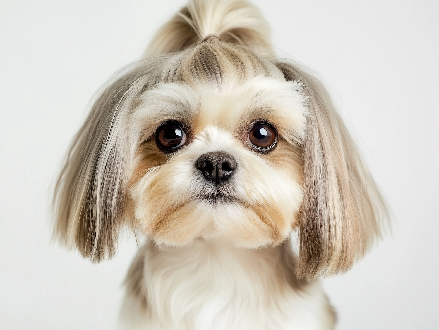 Adorable Shih Tzu with a topknot, big brown eyes, and a neatly groomed coat in white and beige tones. Perfect for dog lovers!