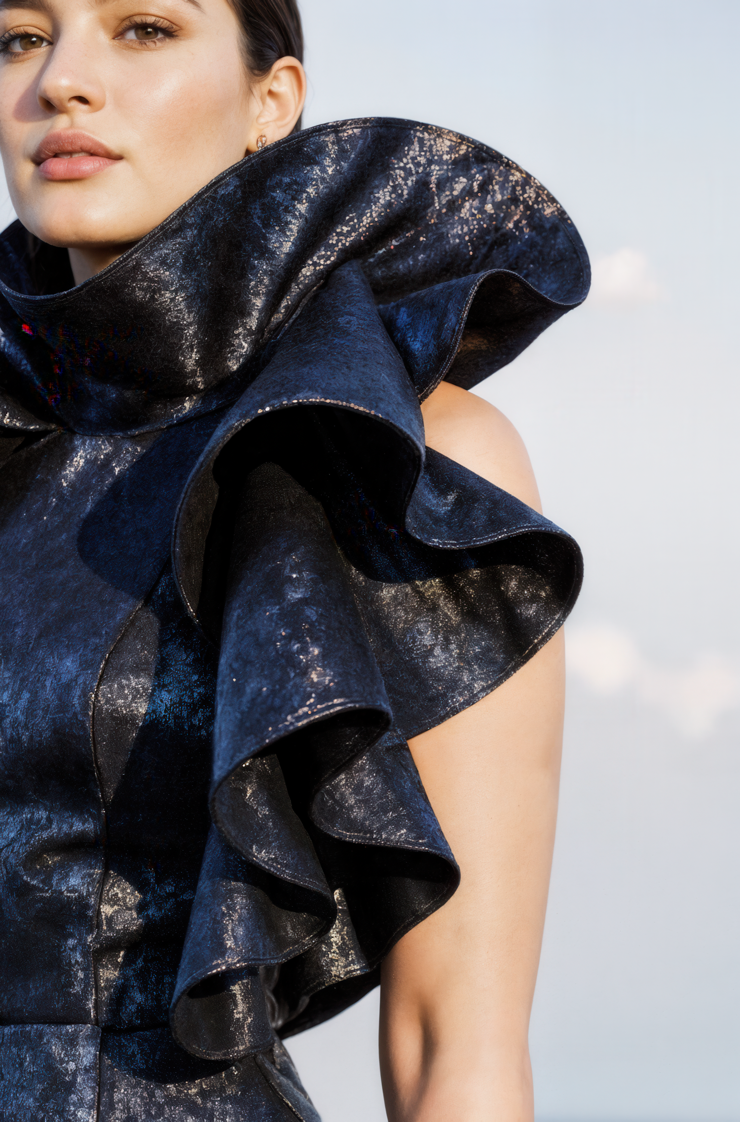 Close-up of a person in a shimmering dark blue ruffled outfit, showcasing intricate textures and elegant design.