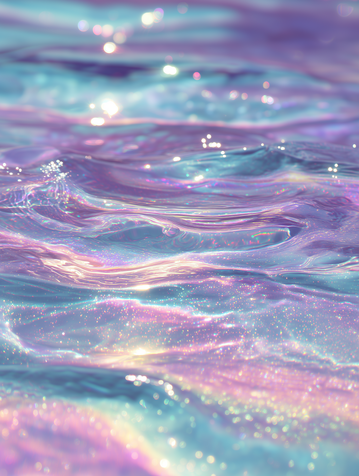 A dreamy, iridescent liquid surface with soft ripples and sparkling reflections in pastel hues of blue, purple, and pink.