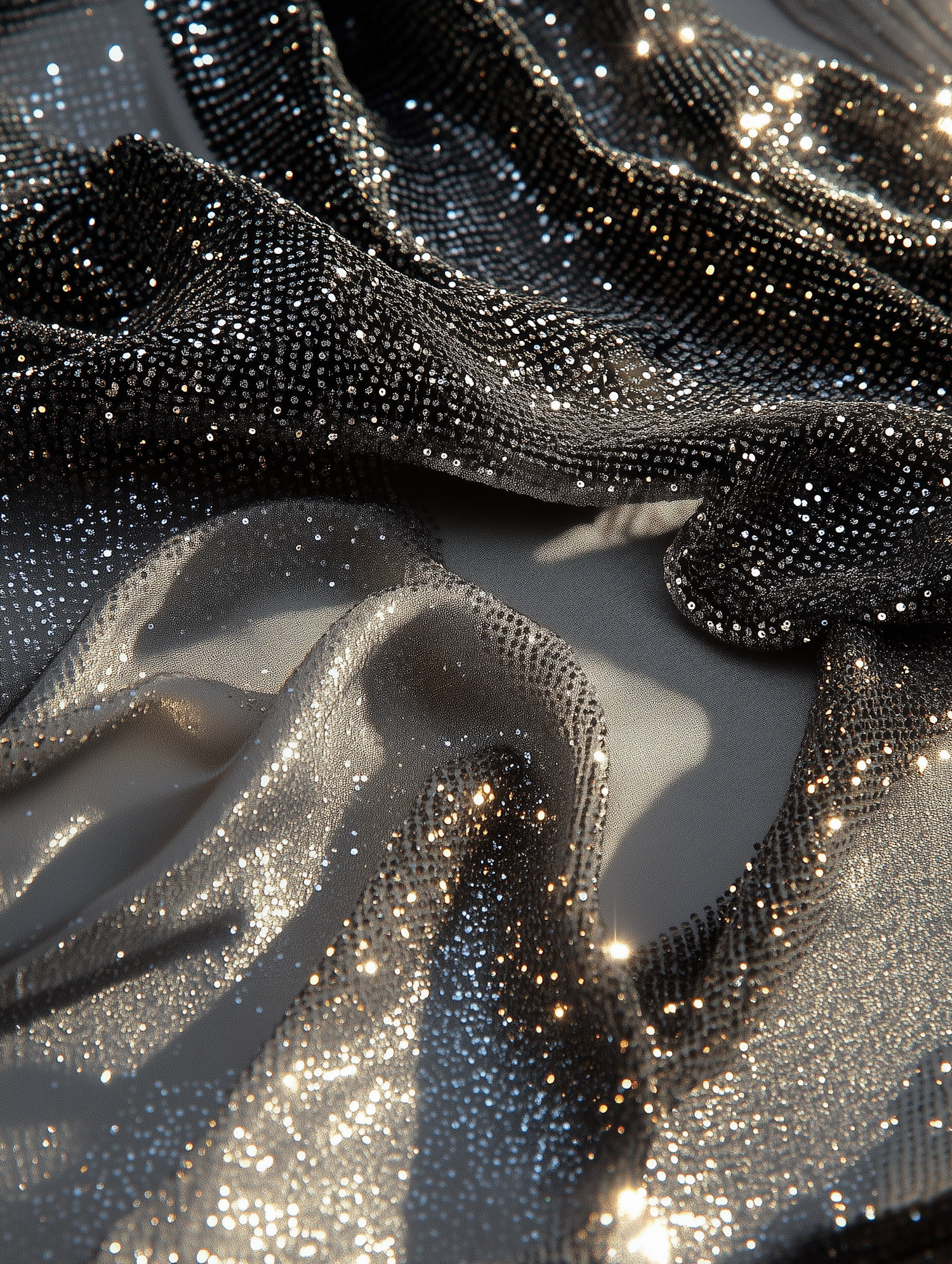 Luxurious sequined fabric draped elegantly, reflecting light with a dazzling effect. Rich dark color enhances its opulent appearance.