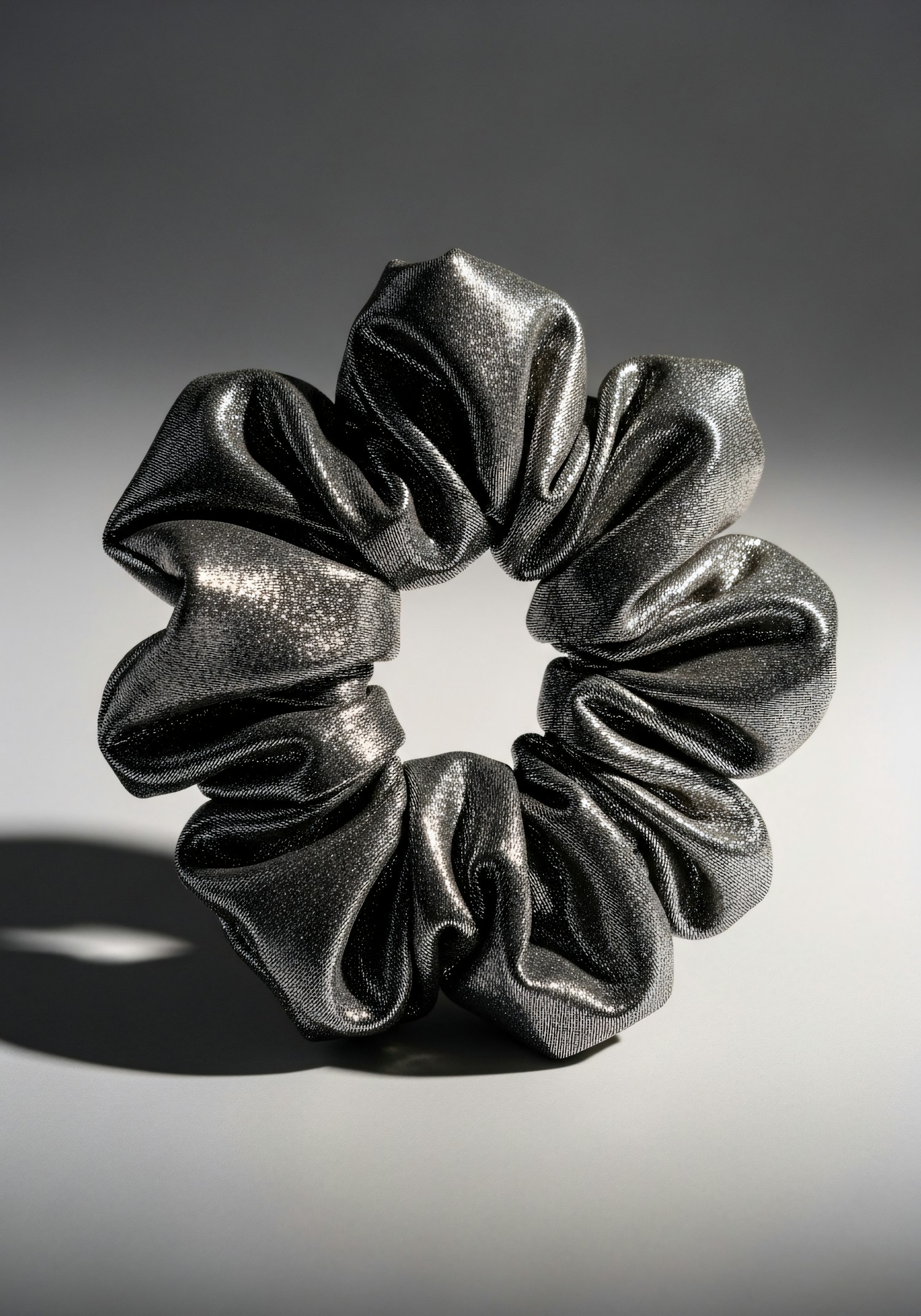A metallic silver scrunchie with a shimmering finish, displayed against a neutral background, highlighting its texture and design.