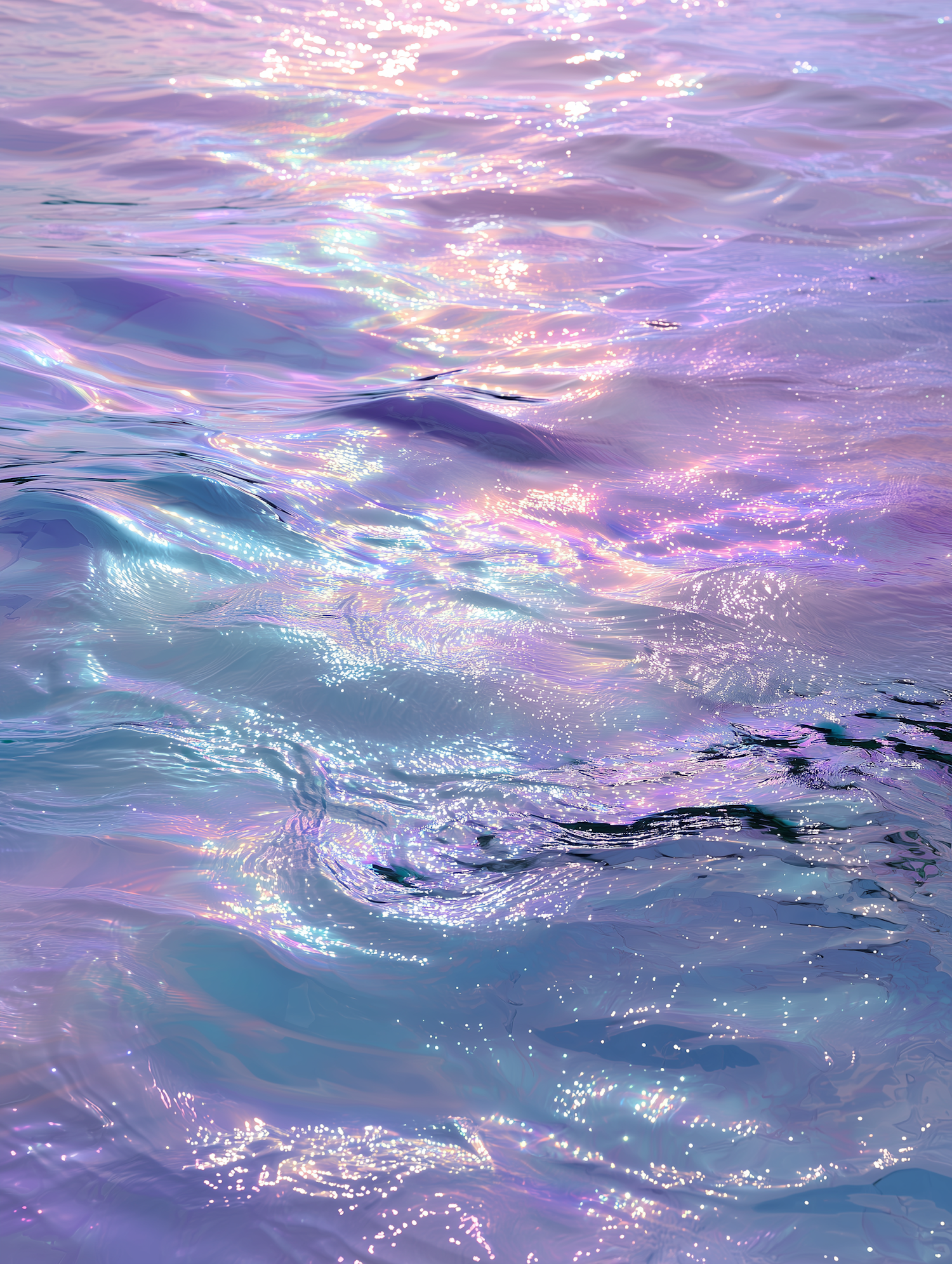 Shimmering iridescent water with soft purple, pink, and blue hues, creating a dreamy and magical visual effect.