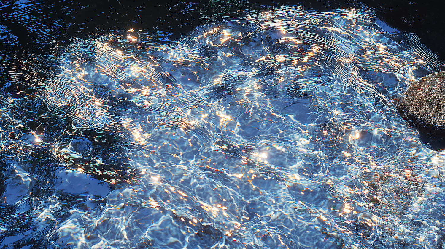 Sunlight reflects on rippling water, creating a shimmering effect with blue and golden hues, accompanied by a dark stone on the side.