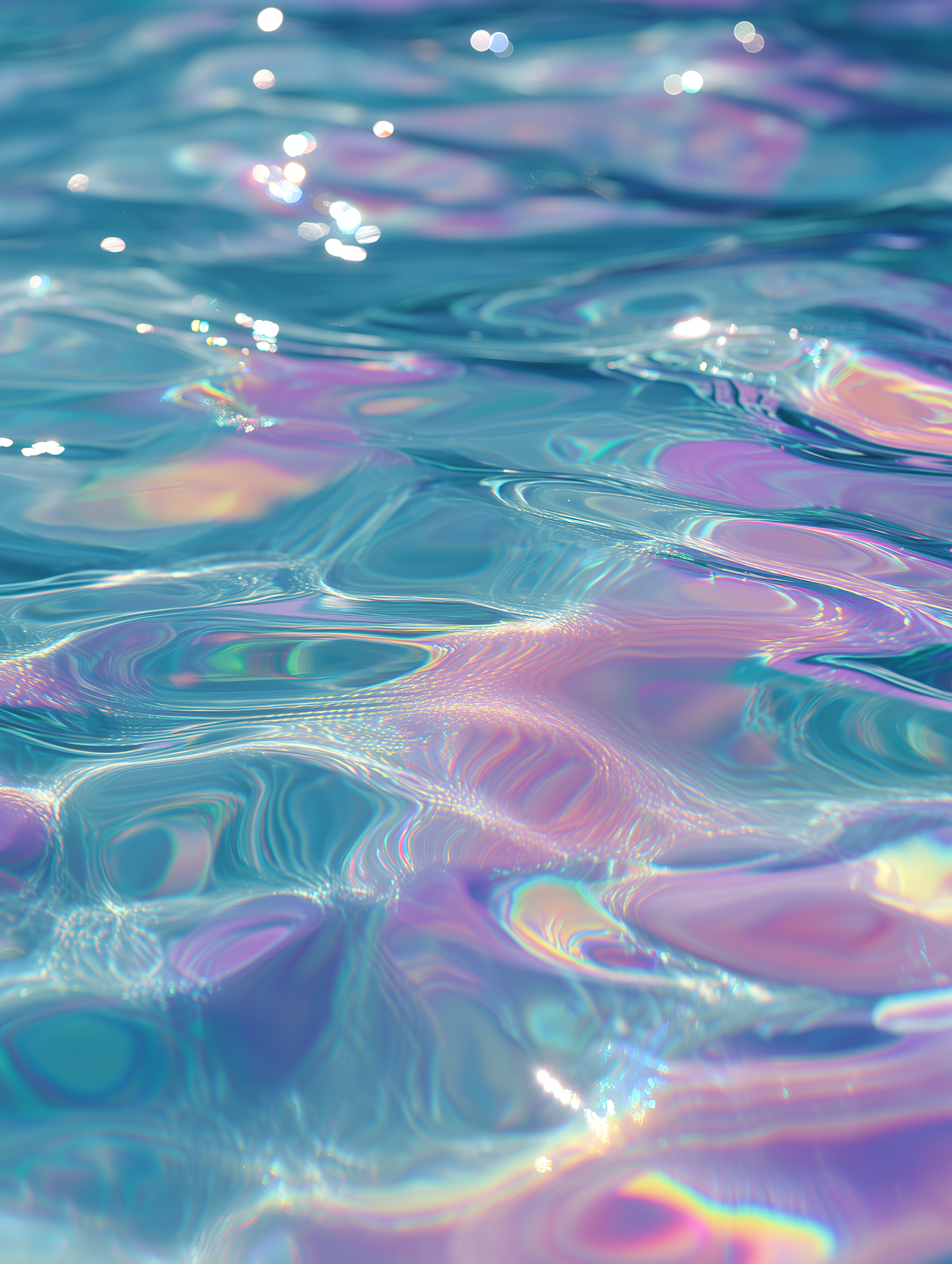 A mesmerizing close-up of shimmering water with iridescent hues of blue, pink, and purple, creating a tranquil and dreamy atmosphere.