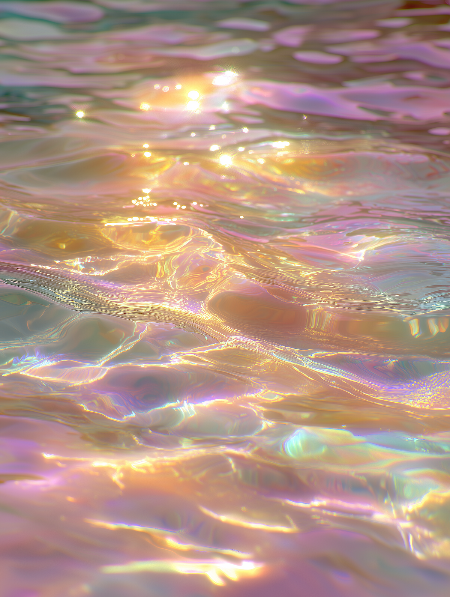 A mesmerizing close-up of shimmering water with iridescent hues of gold, pink, and blue, creating a dreamy and tranquil abstract effect.