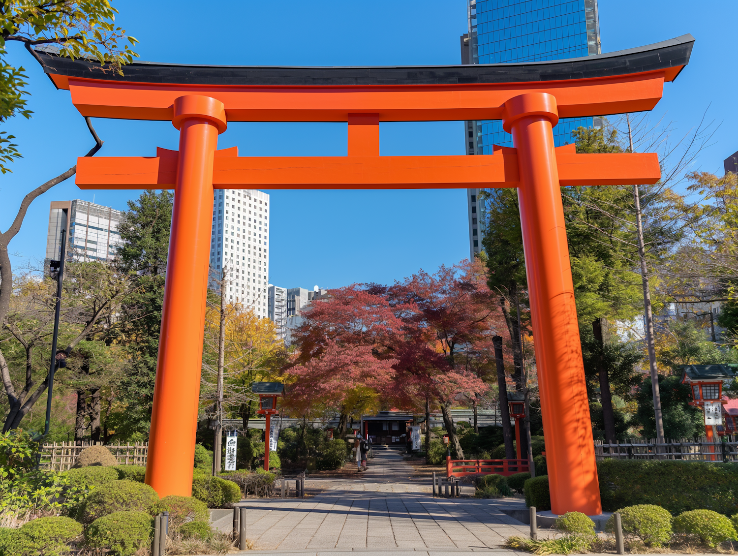 Vibrant red torii gate with autumn foliage and skyscrapers in the background, blending tradition and modernity.