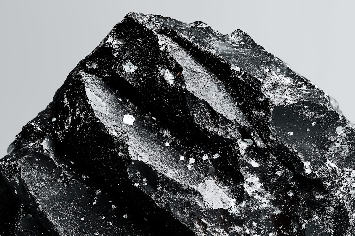 Close-up of a shiny black mineral with reflective facets and white specks, showcasing its jagged crystalline structure.