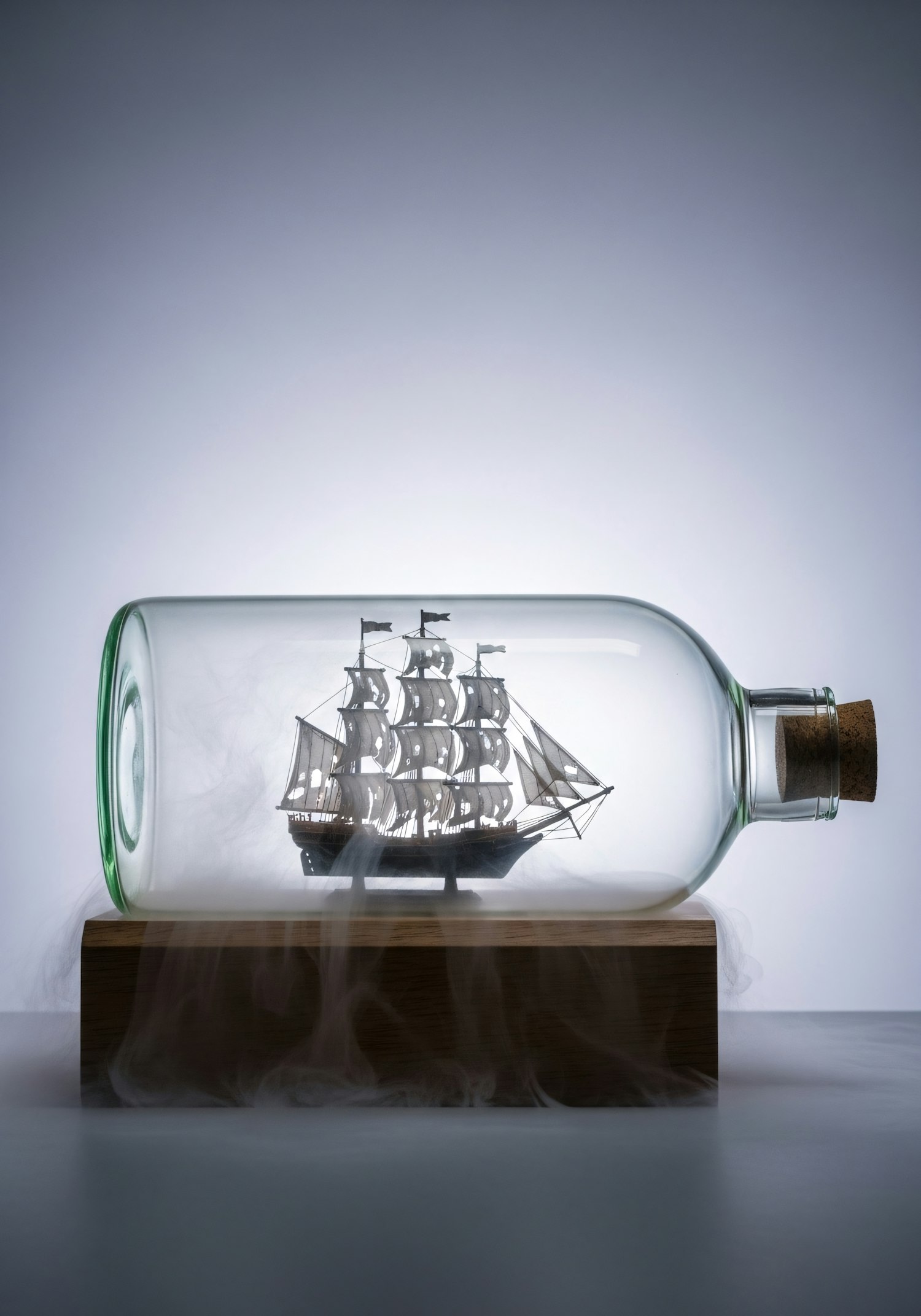A detailed ship model encased in a glass bottle, resting on a wooden base with a misty effect, showcasing intricate craftsmanship.
