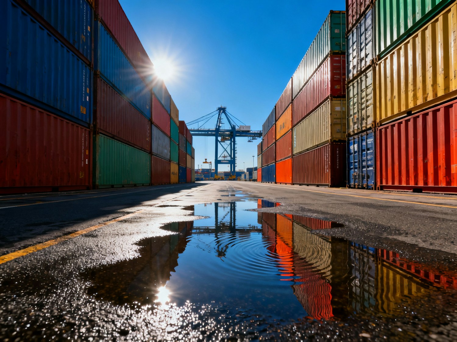 A vibrant shipping yard with colorful stacked containers, a reflective puddle, and a crane under bright sunlight.