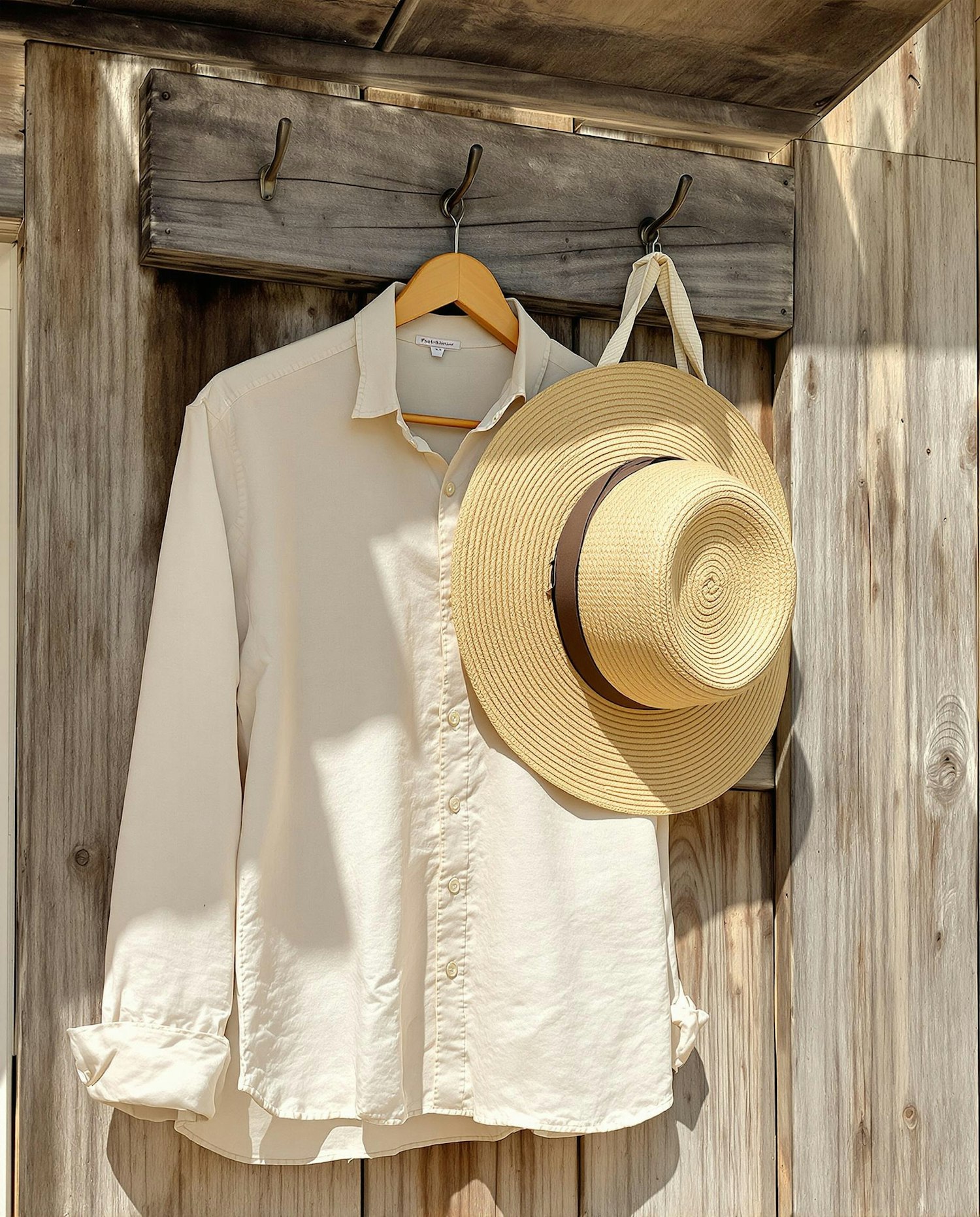 A beige linen shirt and straw hat hanging on a wooden hook outside a beach bungalow, sunlit and breezy atmosphere