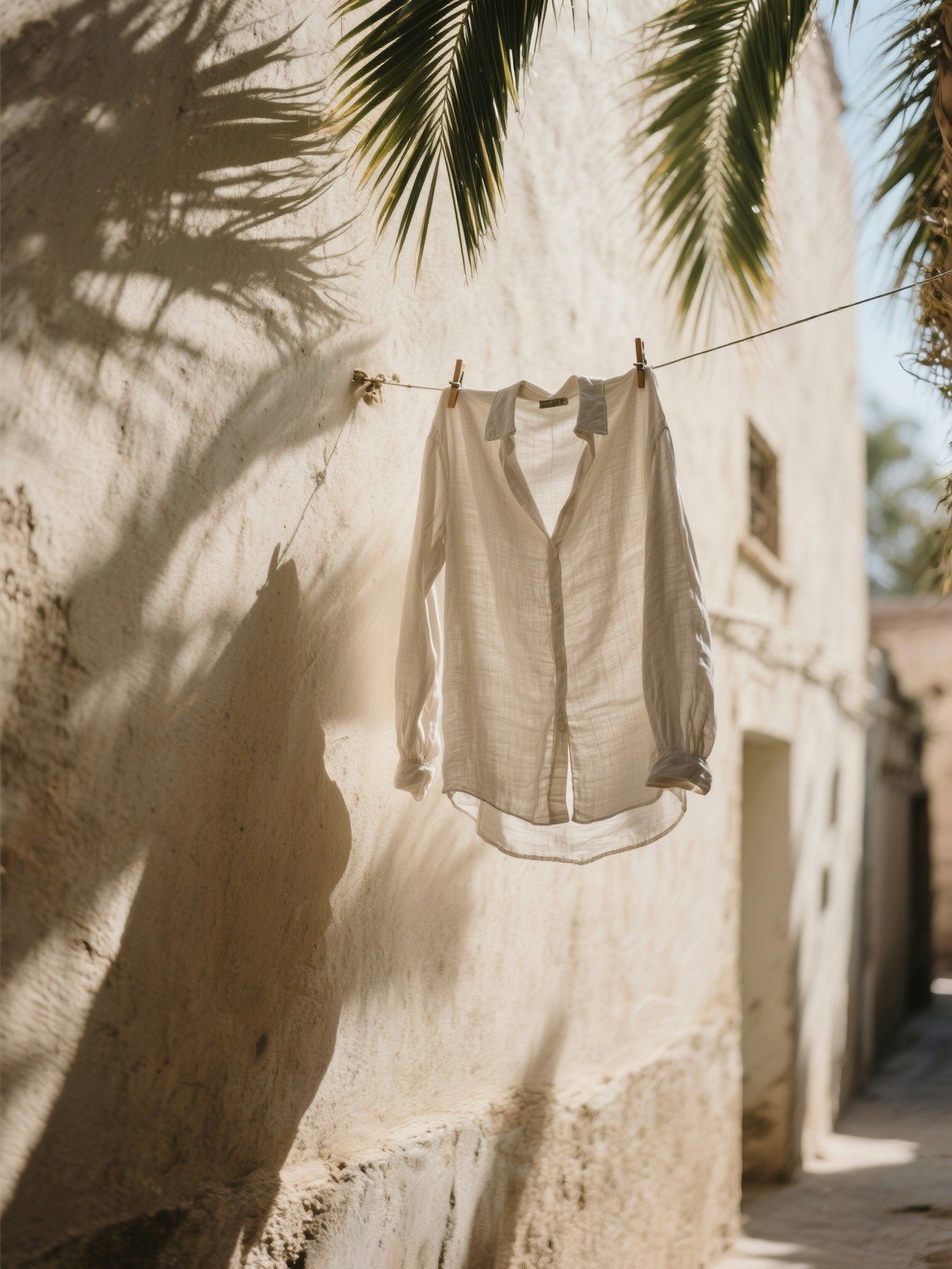 Soft natural light, muted faded colors, desaturated tones, light and airy palette, visible film grain, cinematic composition, candid imperfect capture, off-center framing, artistic angles, lifestyle photography, dreamy atmosphere, high resolution, realistic textures, slight blur or motion imperfections, soulful timeless aesthetic — narrow sunlit alley with textured beige walls, linen shirt hanging from a clothesline above, warm breeze lifting the fabric, shadows of palm fronds swaying across the walls