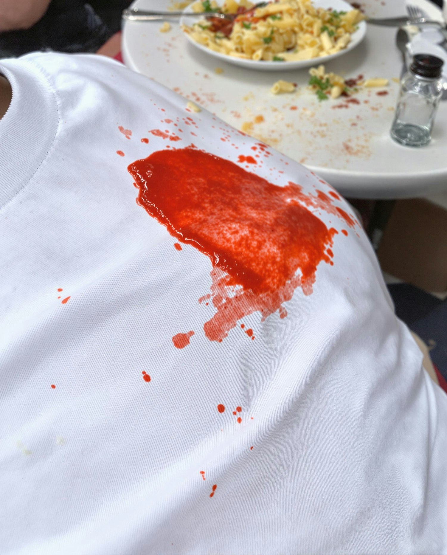 Red pasta sauce spilled on a white shirt in a casual dining setting, emphasizing a relatable dining mishap causing a bright stain.