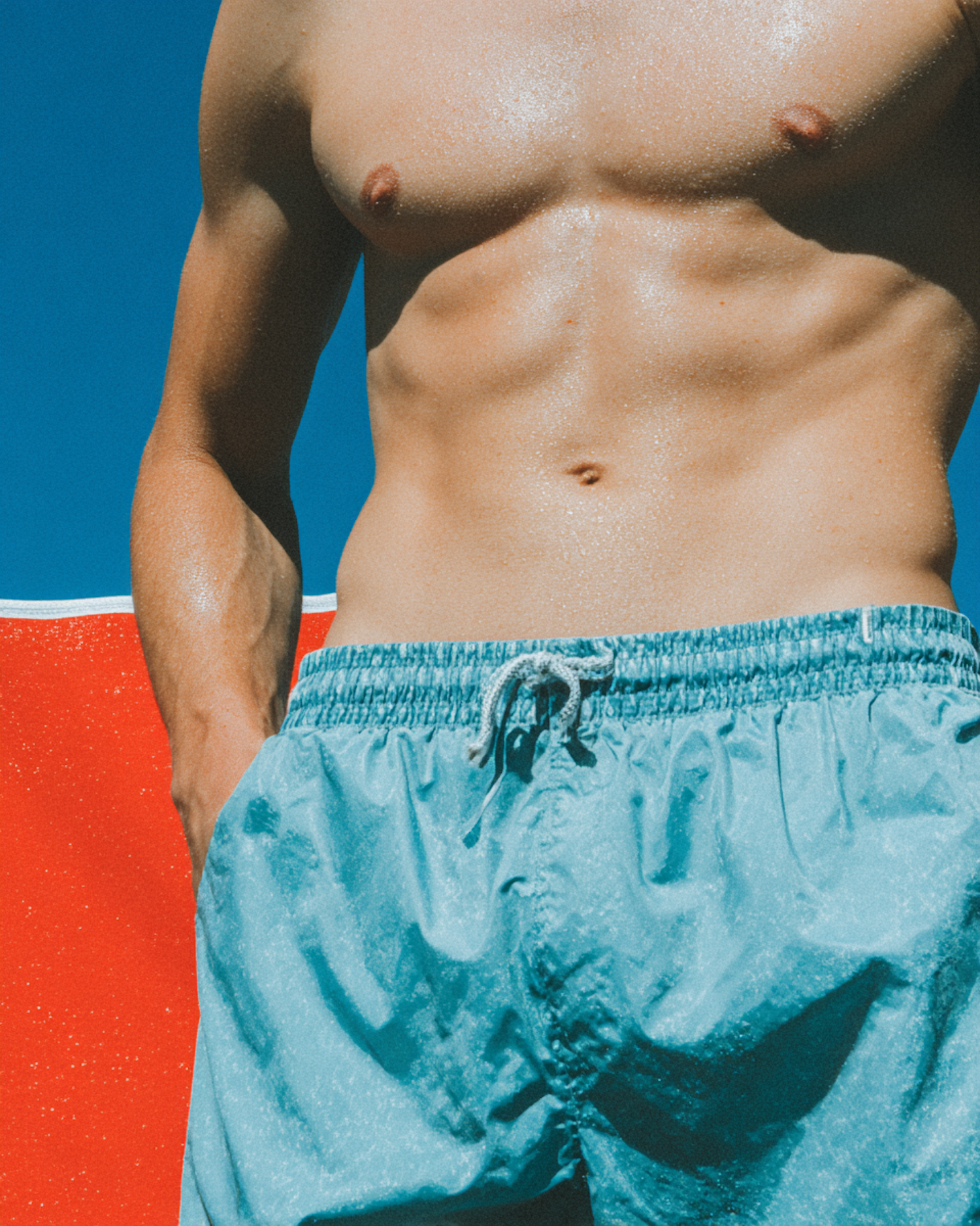 Close-up of a shirtless person in blue swim shorts against a vibrant red and blue background, evoking a sunny, beachy vibe.