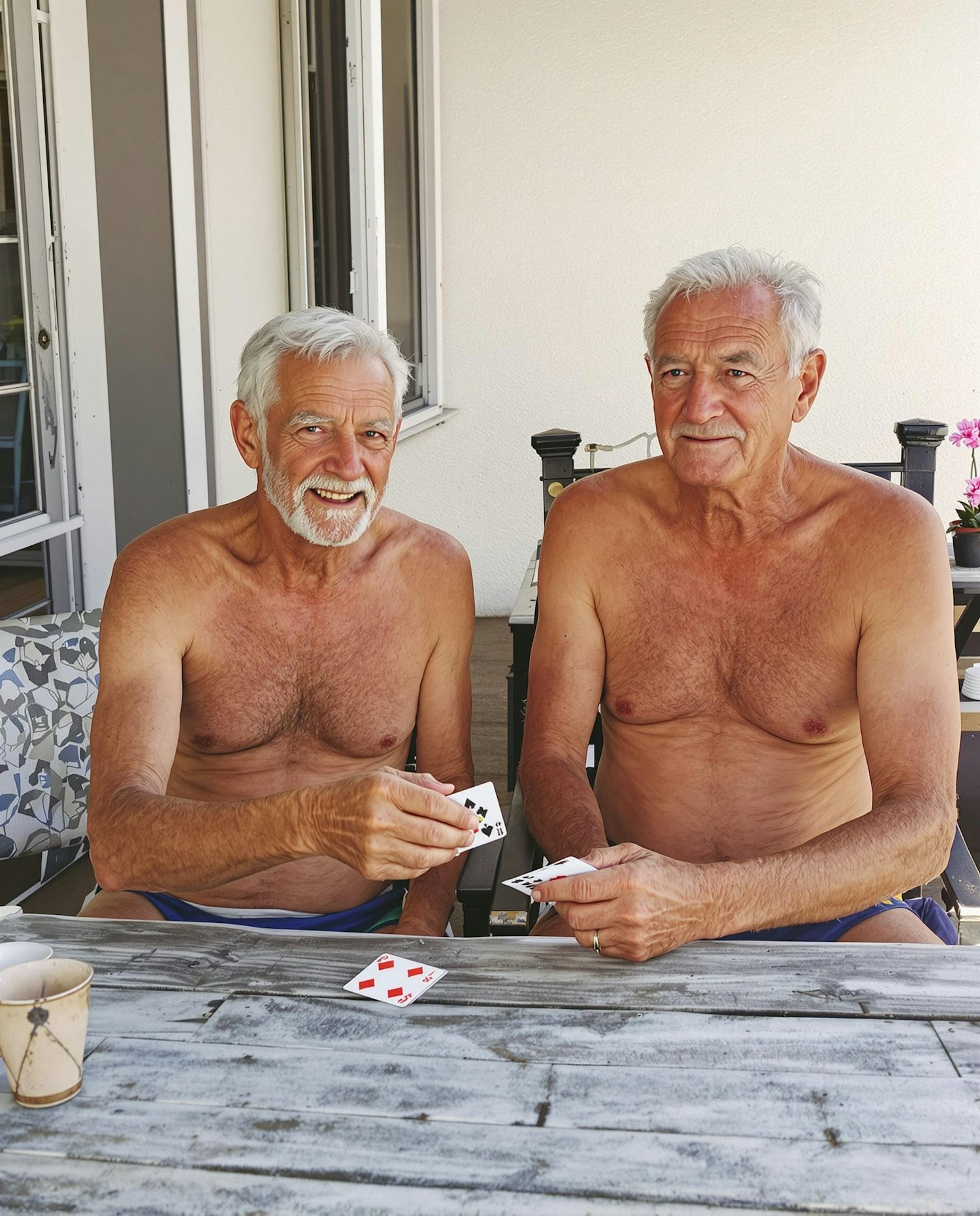 Natural daylight photo with warm tones and subtle contrast, slightly overexposed highlights, soft shadows, and a light analog grain. Vibrant but realistic colors with a summery, editorial feel. The photo should look candid, fun, and lightly ironic, with a touch of spontaneity and humor. Two elderly friends sitting shirtless at a weathered table outdoors, playing cards seriously while one of them secretly hides a joker in their swimsuit waistband. Harsh sun, dry skin, casual summer vibe.