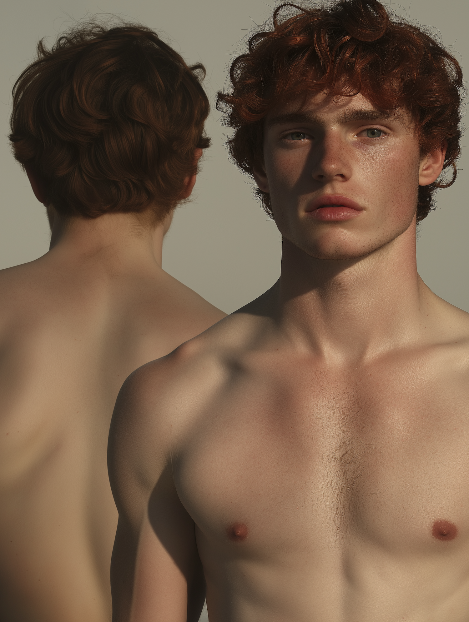 Young man with curly red hair and fair skin, facing forward with a neutral expression. Soft lighting highlights his features.