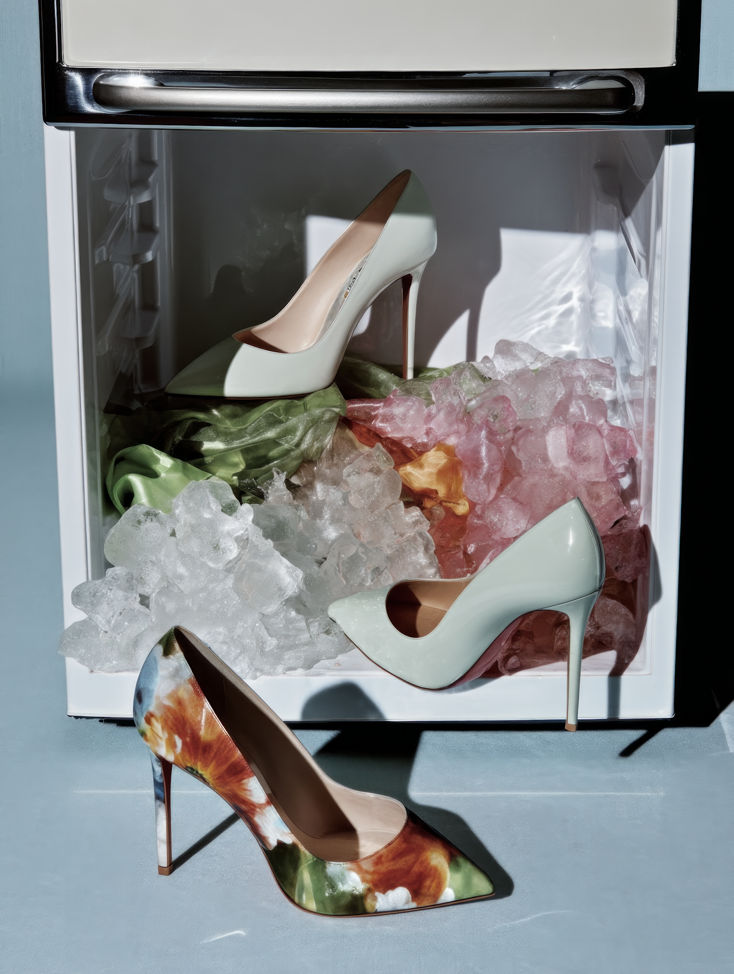 Elegant high-heeled shoes, one pastel green and one floral, displayed creatively in a freezer drawer filled with ice and fabric.