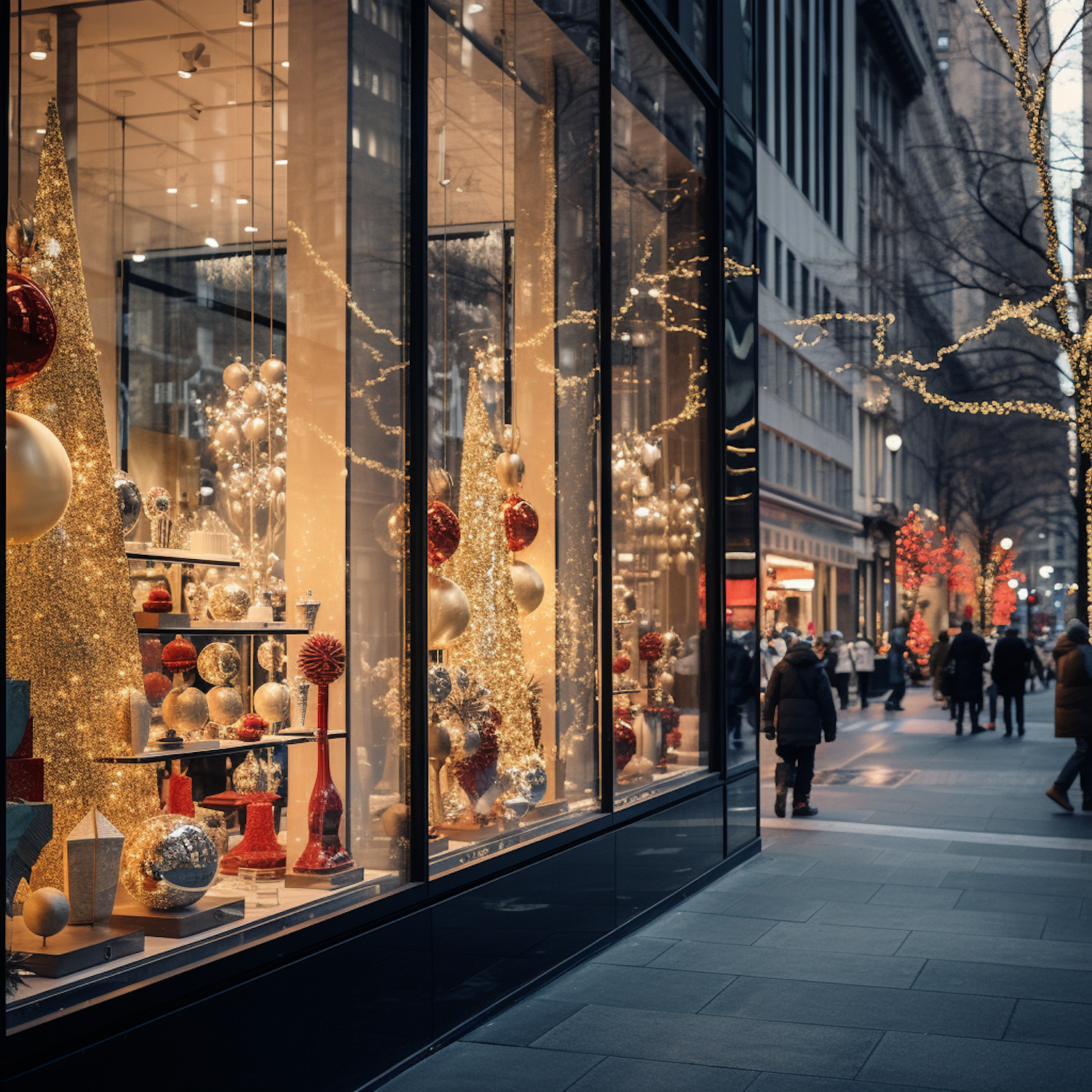 Festive city street with a sparkling holiday window display, golden ornaments, and twinkling lights. People stroll in winter attire.