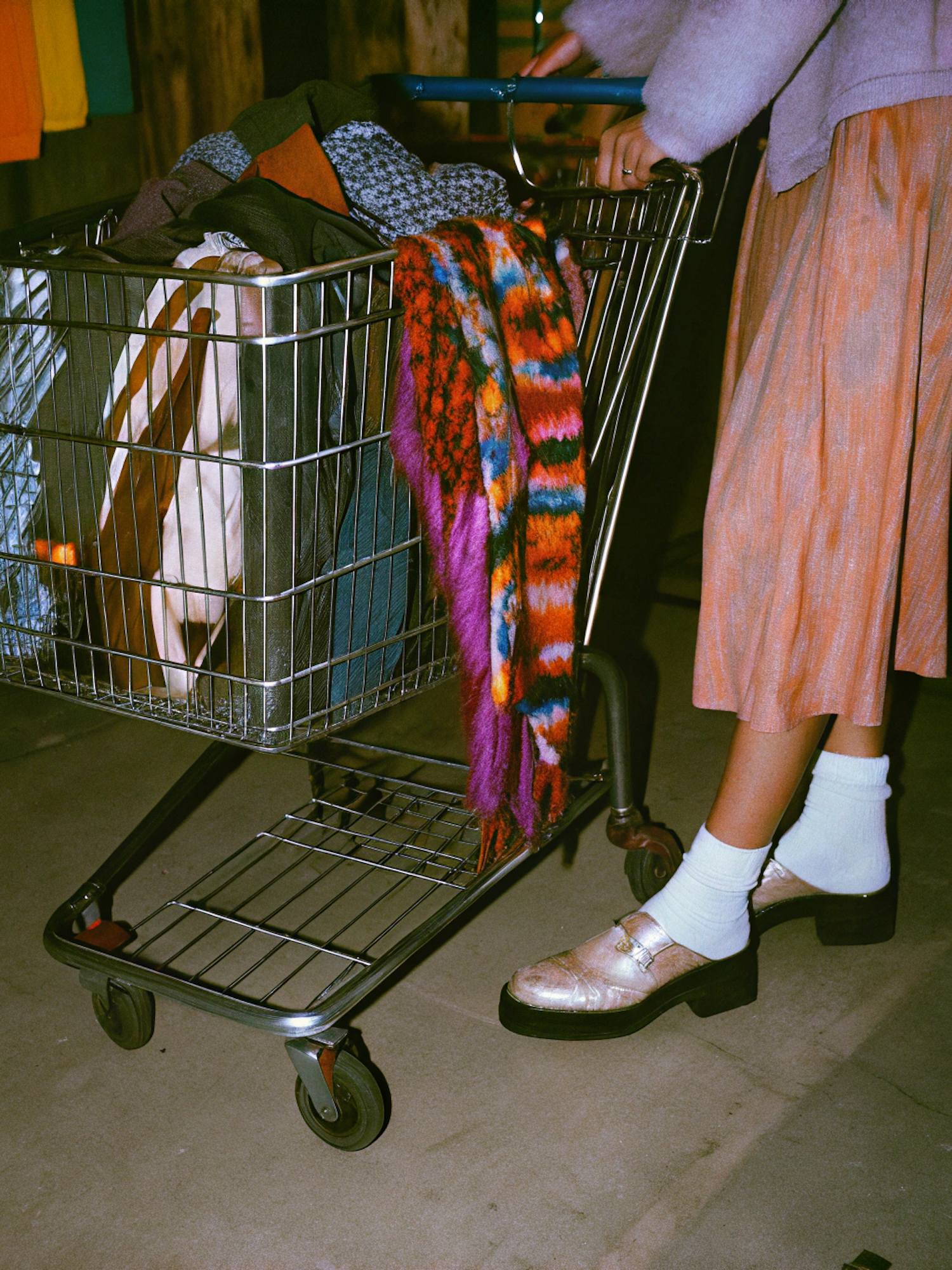 A shopping cart filled with colorful clothes, a multicolored scarf, and a person in a lavender sweater, peach skirt, and metallic shoes.