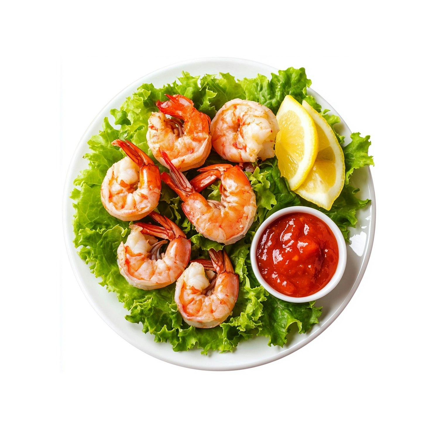 Fresh shrimp cocktail on lettuce with cocktail sauce and lemon wedges, beautifully presented on a white plate.