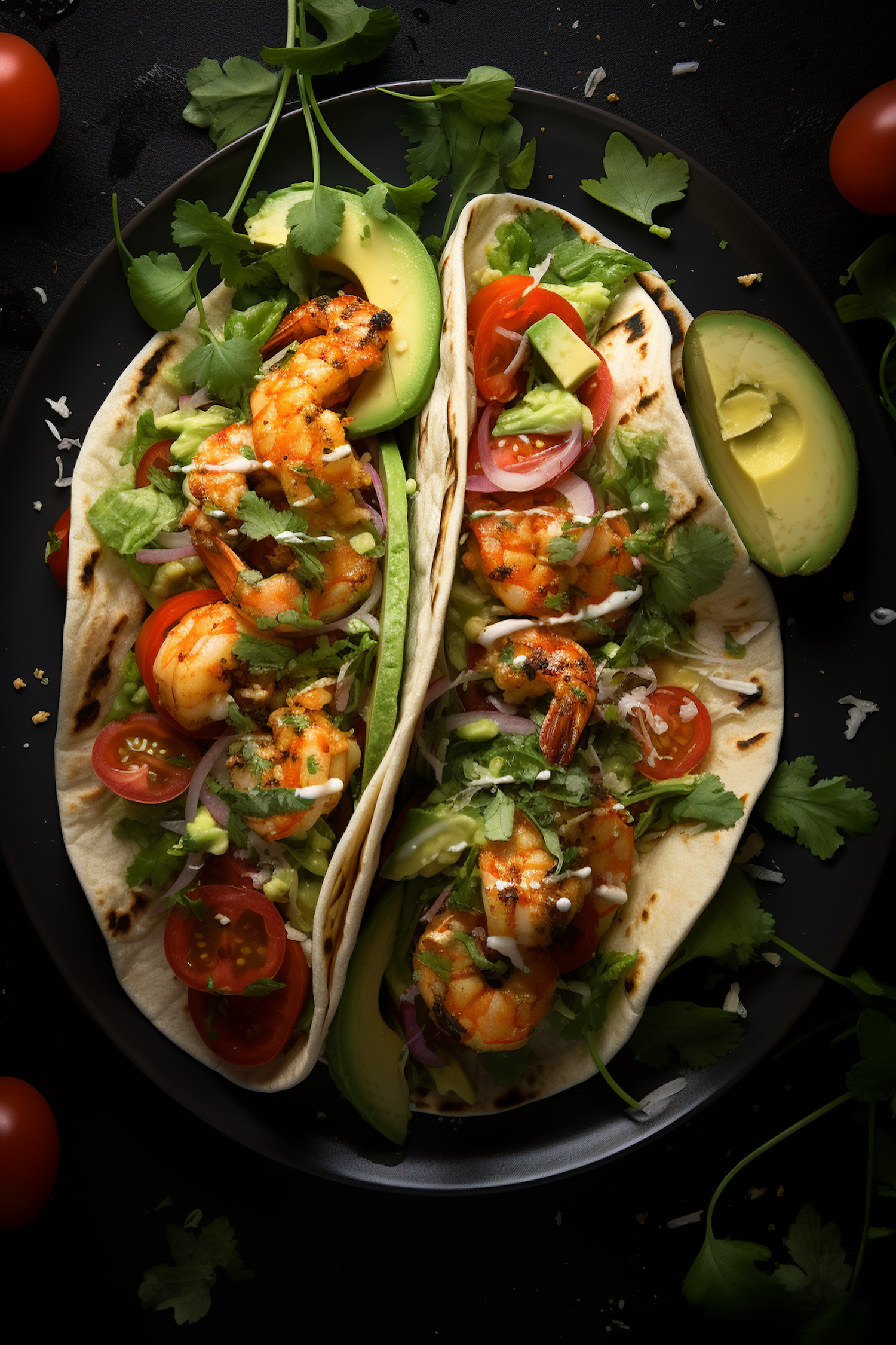 Delicious shrimp tacos with avocado, cherry tomatoes, and cilantro on a dark plate, garnished with white sauce and fresh herbs.