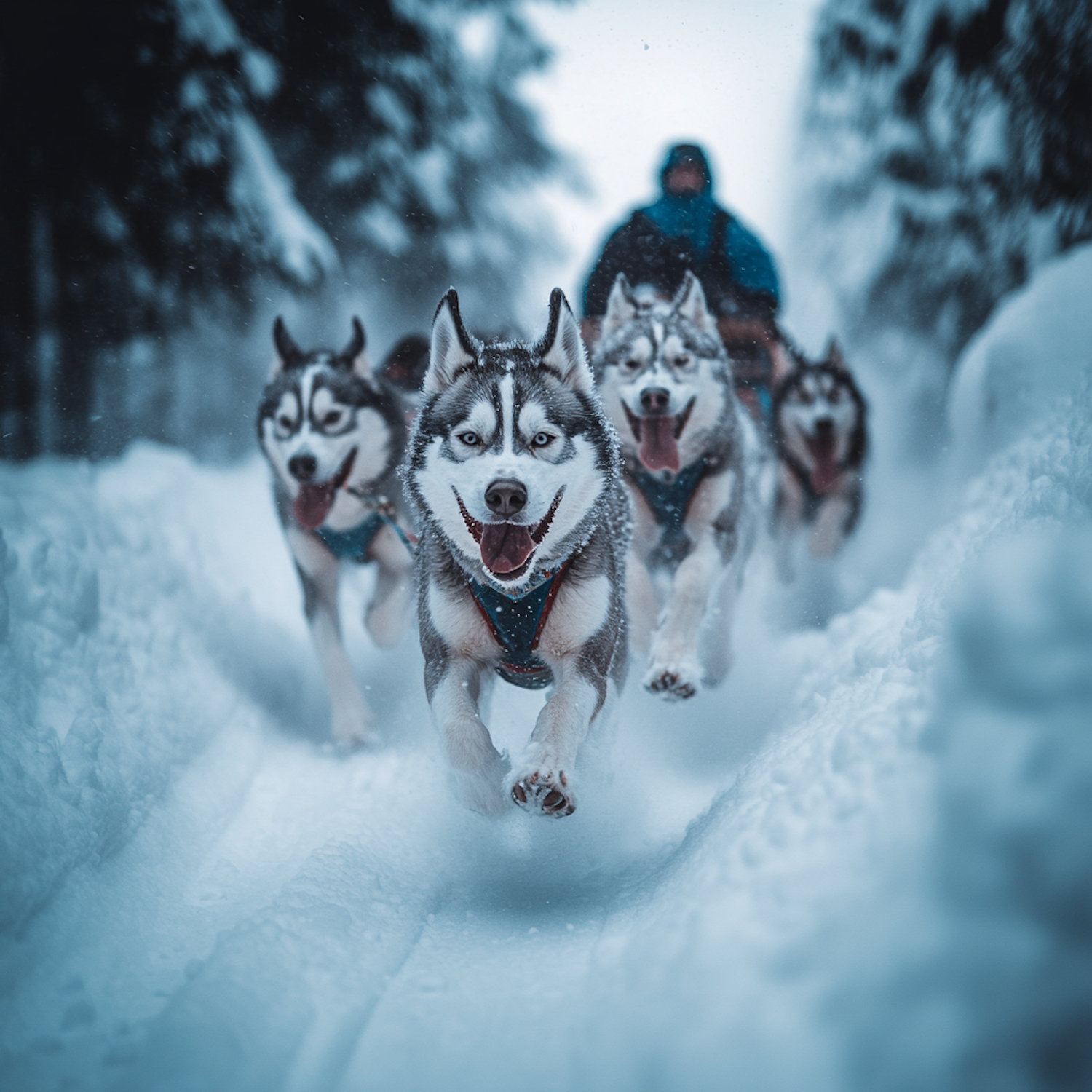 Siberian Huskies pulling a sled through a snowy forest, showcasing dynamic movement and teamwork in a winter wonderland.