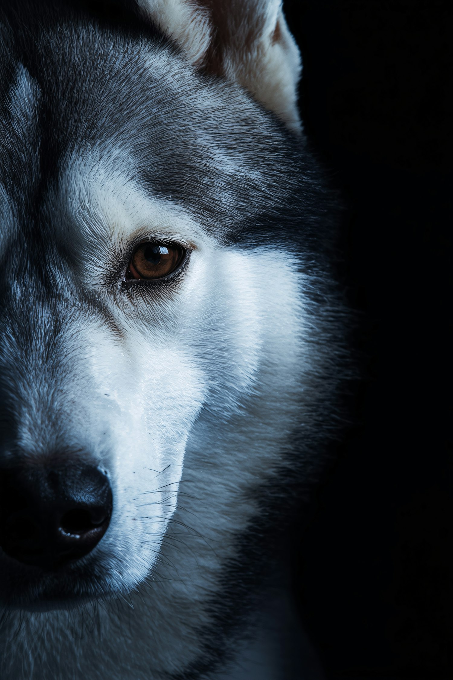 Close-up of a Siberian Husky's face with striking white and gray fur and a deep brown eye, set against a dark background.