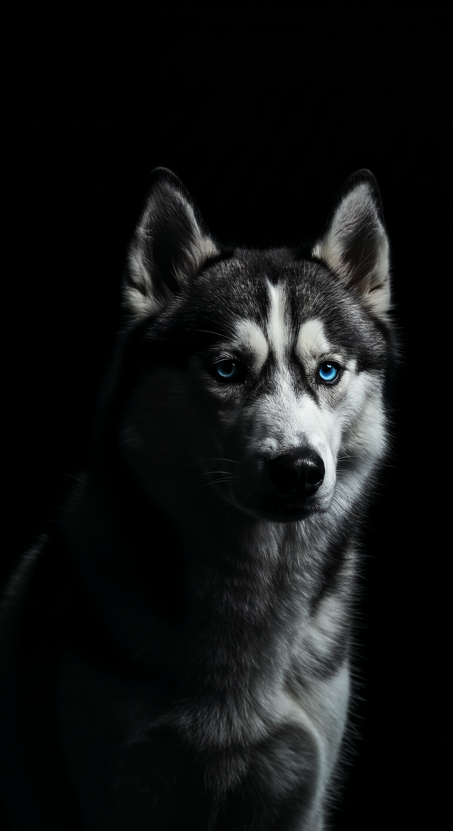 Close-up of a Siberian Husky with piercing blue eyes, dramatic lighting, and a black background highlighting its striking features.