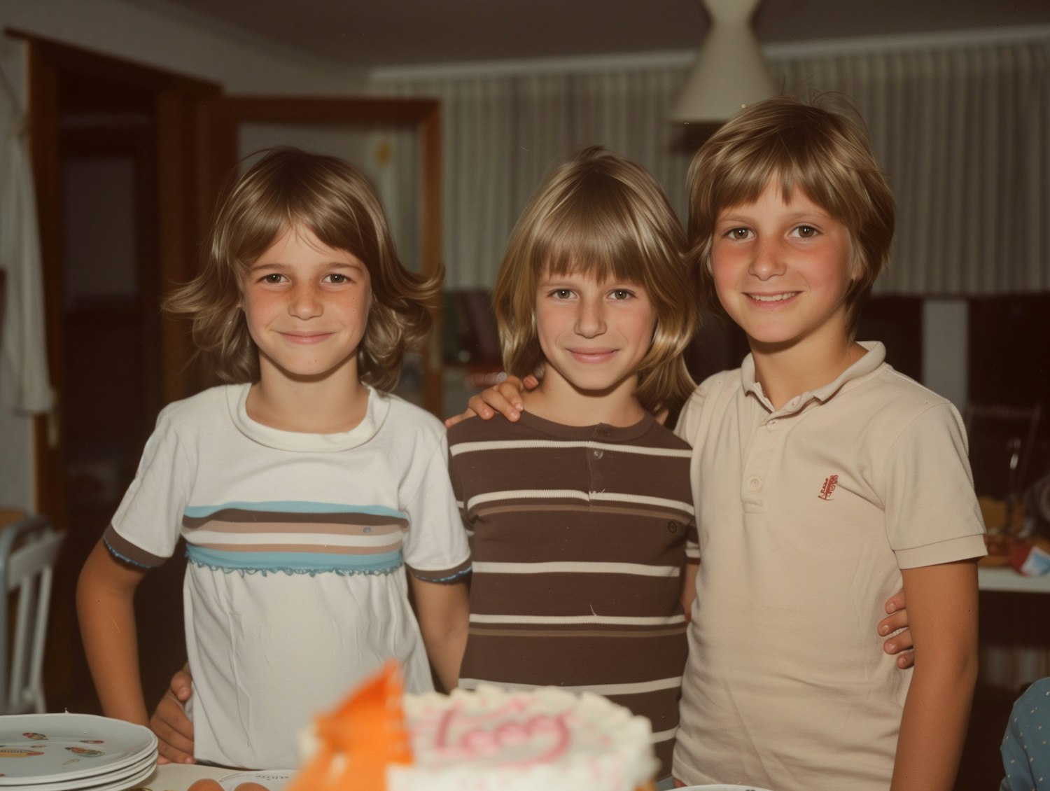 Three smiling children with light brown hair stand together indoors, celebrating with a cake. Cozy and joyful atmosphere.