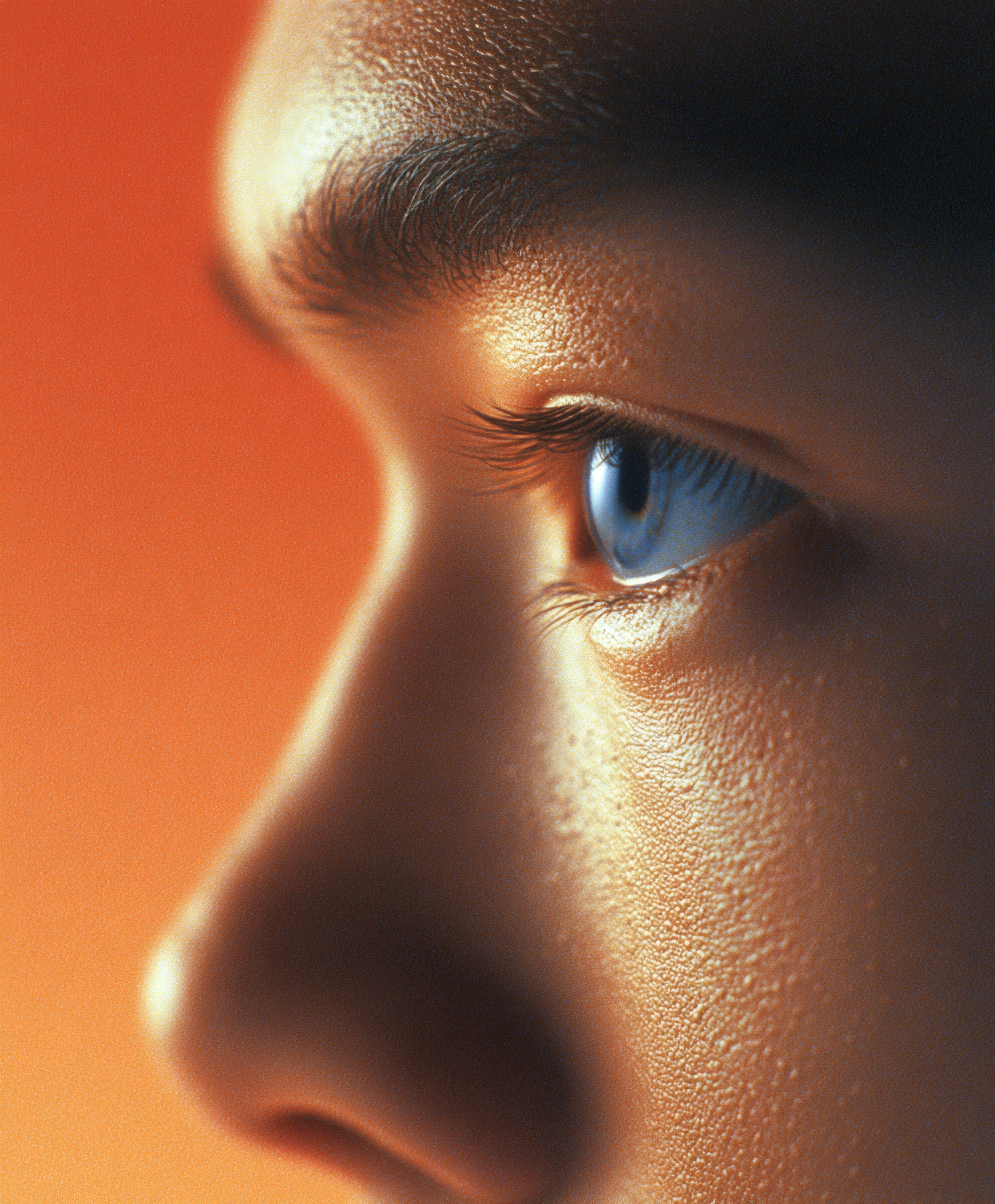 Close-up of a human face side profile with a striking blue eye, detailed skin texture, and a warm orange background.