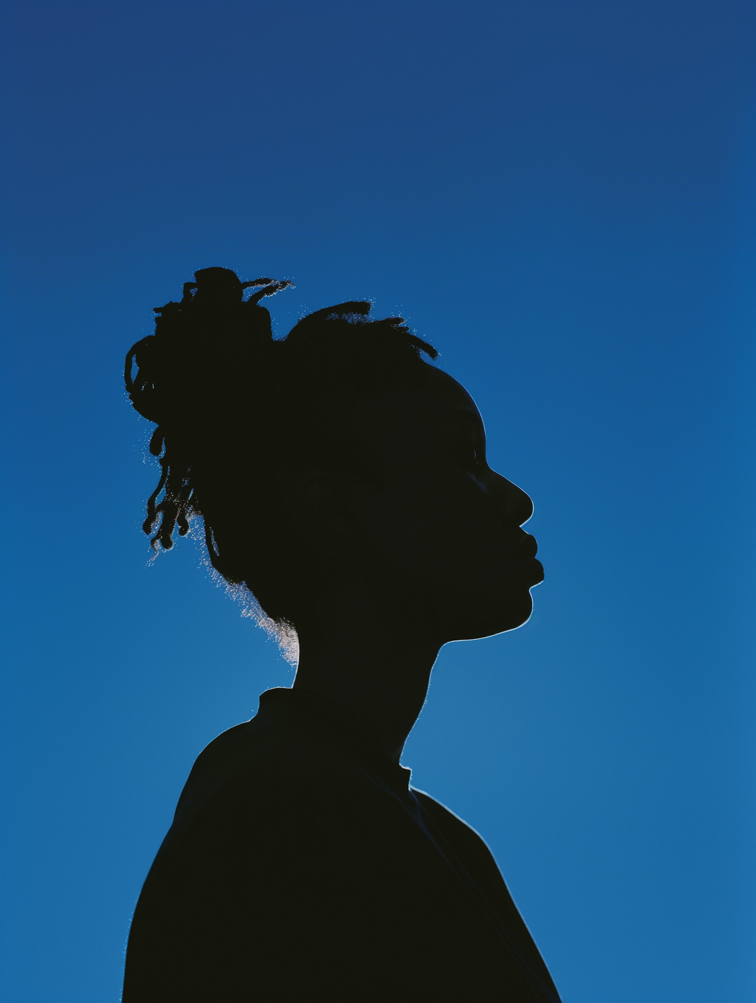 Silhouette of a person with a bun against a bright blue sky, highlighting elegant contours and striking contrast.