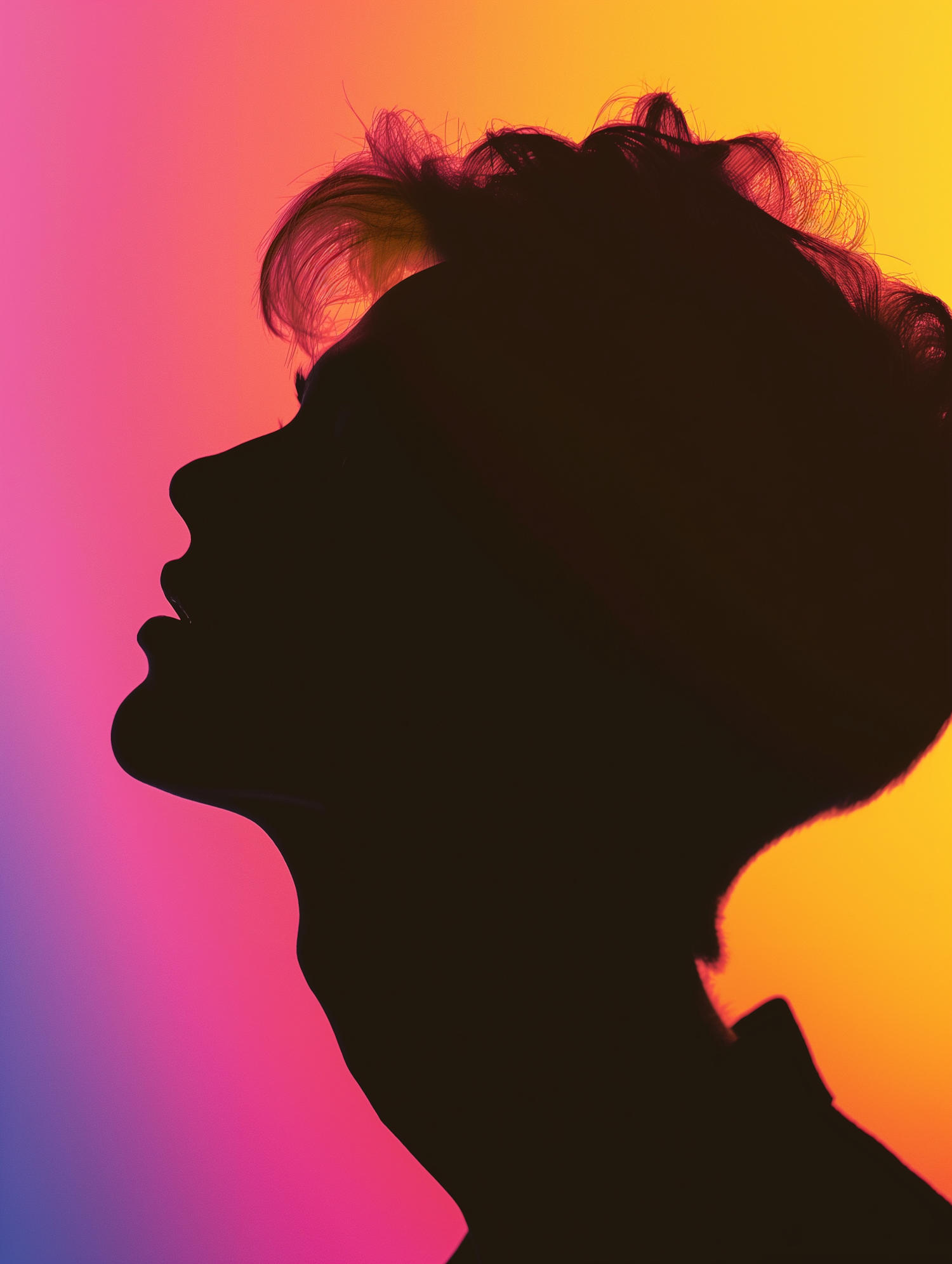 Silhouette of a person against a vibrant gradient background, featuring warm yellow and cool pink hues.