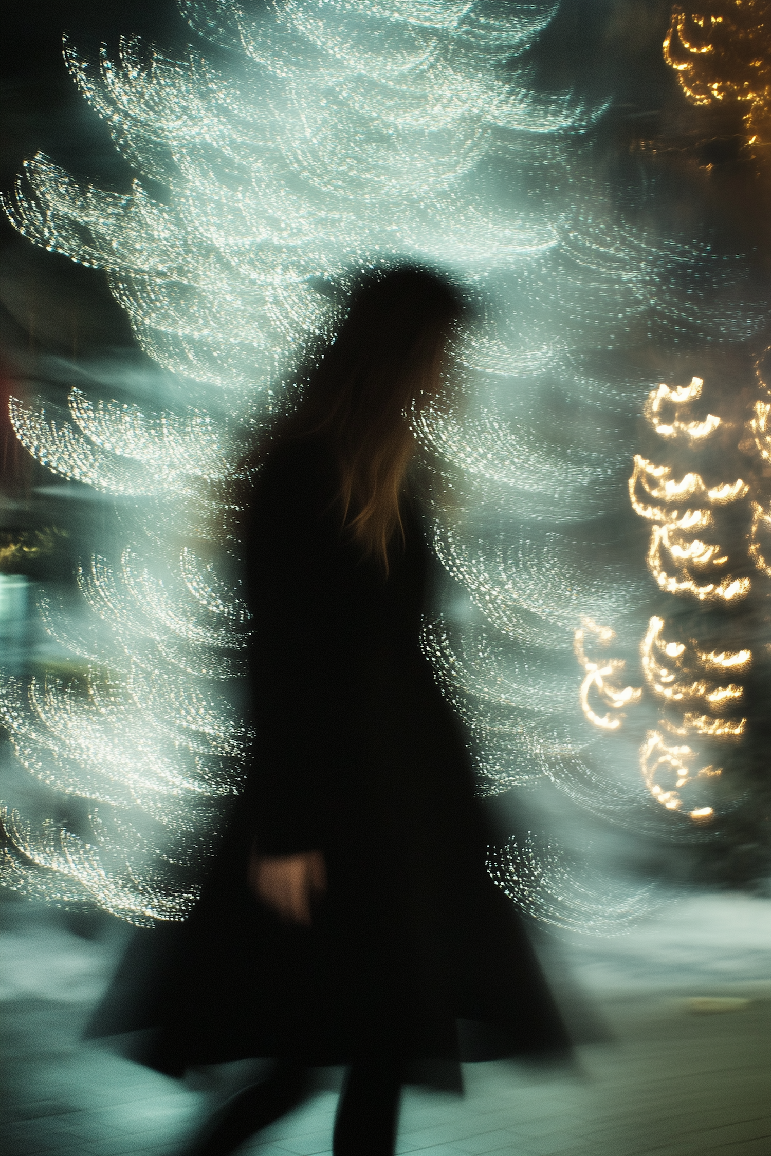 Blurred silhouette of a person walking past a brightly lit Christmas tree with swirling lights, creating a dreamy effect.