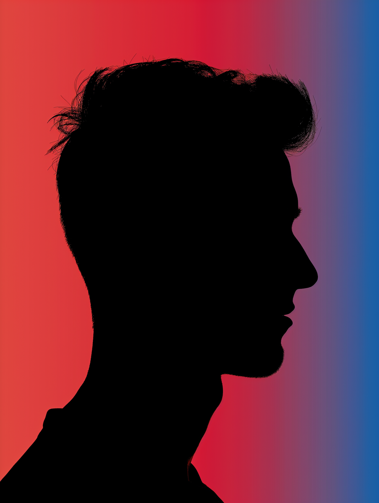 Silhouette of a person in profile against a red to blue gradient background, highlighting a striking contrast.