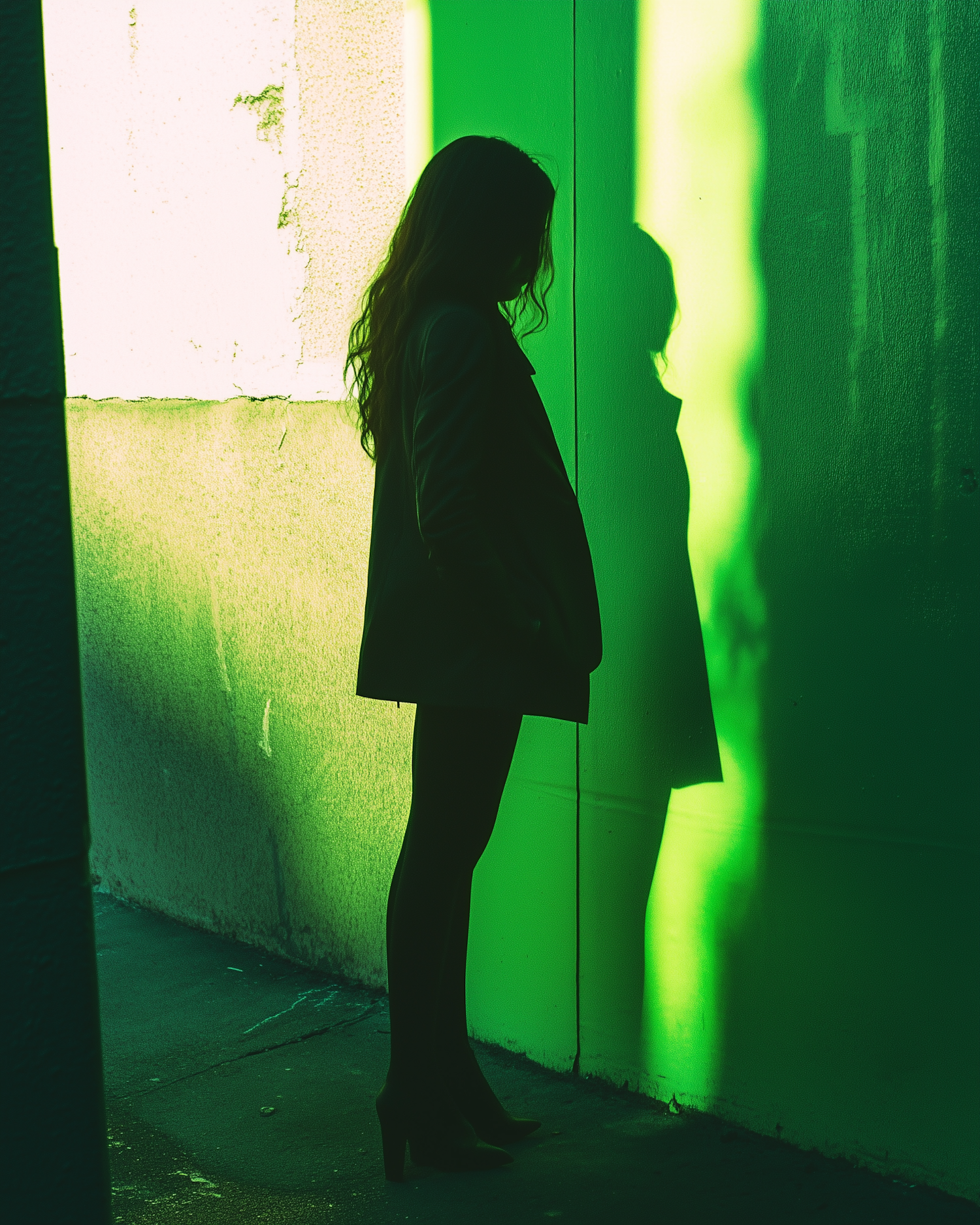 Silhouette of a person against a vibrant green wall, casting a dramatic shadow. Urban setting with artistic lighting and textures.