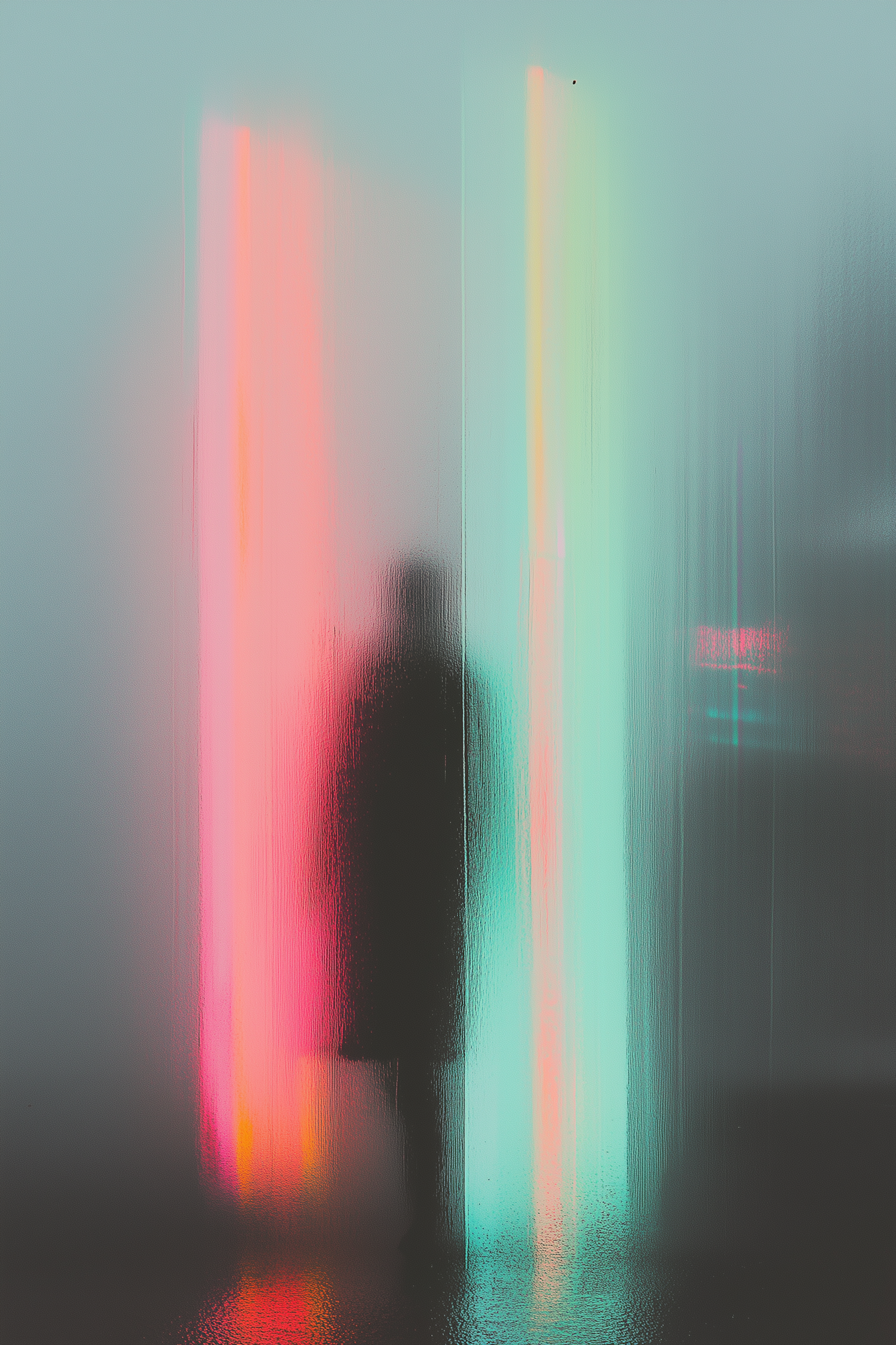 Blurred silhouette against vibrant pink and teal neon lights, creating a mysterious and ethereal atmosphere.