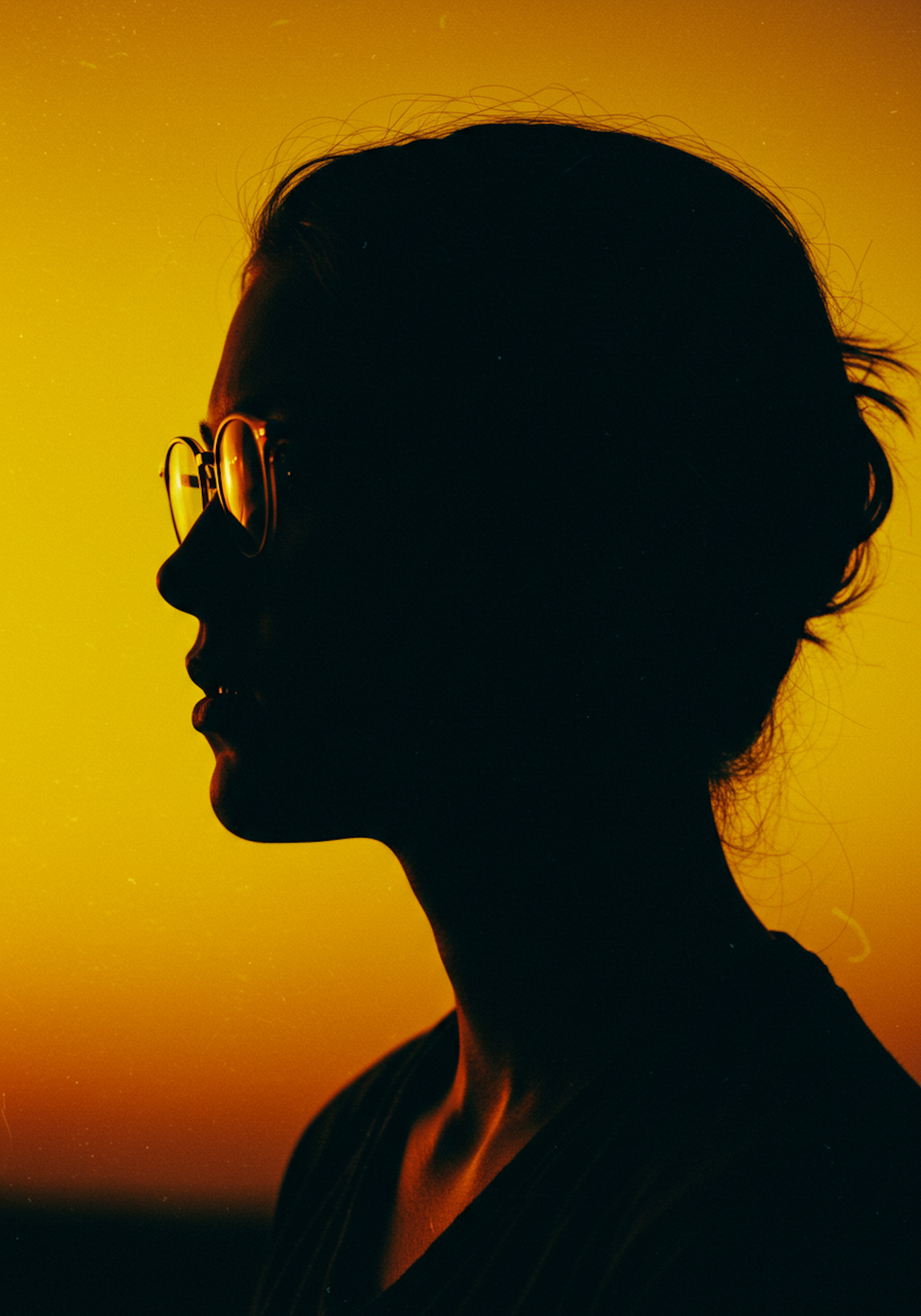 Silhouette of a person with glasses against a vibrant yellow-orange sunset background, creating a dramatic and serene profile view.